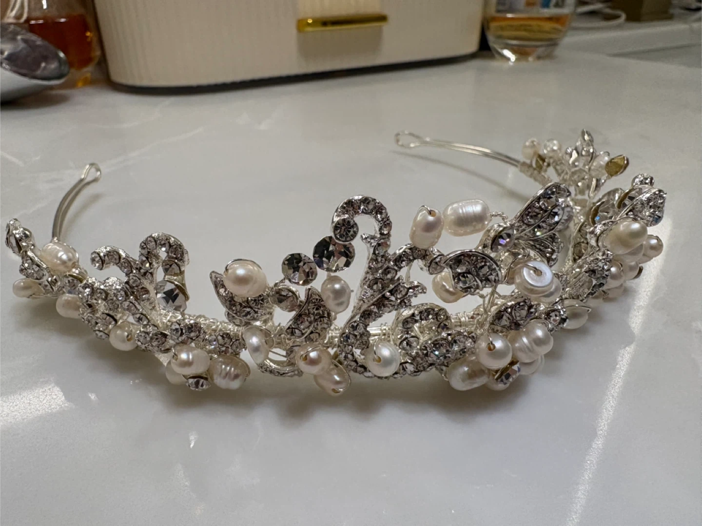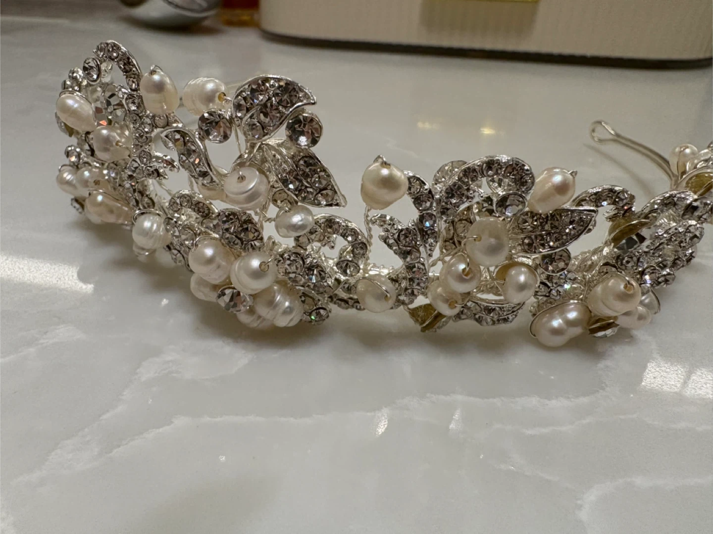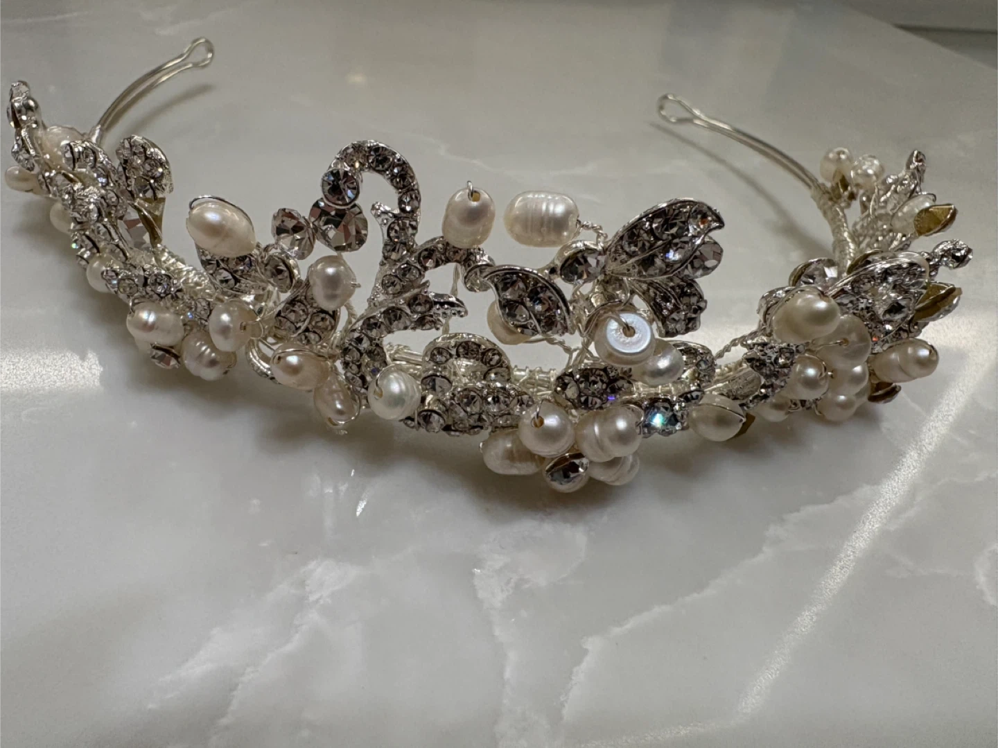 Selling a beautiful tiara adorned with pearls and rhinestones! It's in great condition and would be perfect for a wedding or special occasion! It sparkles beautifully under the lights, and looks very luxurious. It’s brand new from David’s.