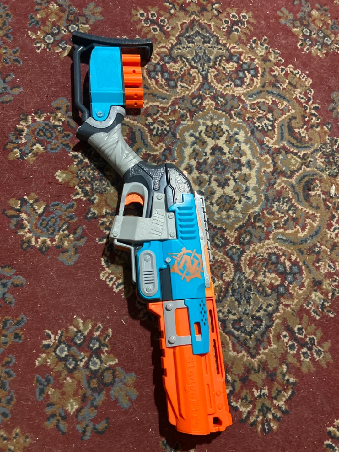 This Nerf N-Strike Elite Disruptor blaster comes in blue and orange. It's a manual action toy, so no batteries are needed for play! Asking 50$