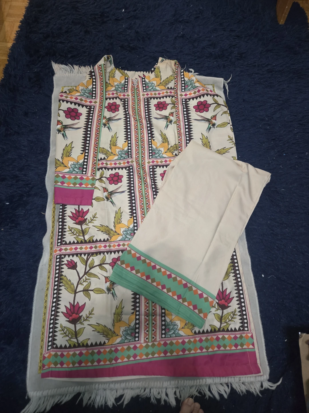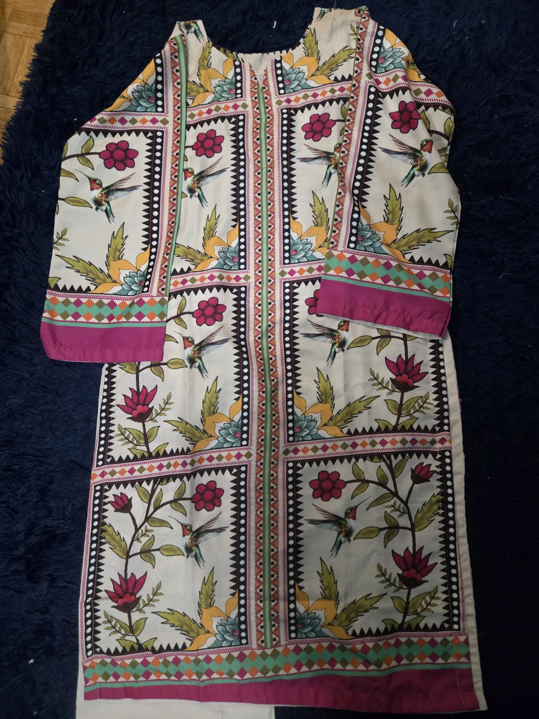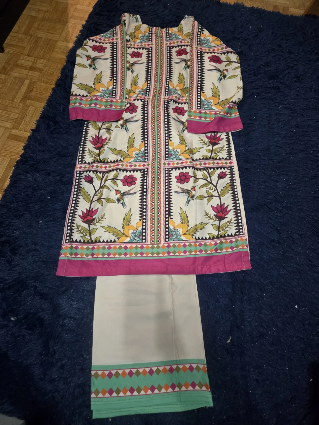 Selling a beautiful salwar kameez suit with a unique floral print. The colours are vibrant and the design is eye-catching. Perfect for a special occasion or everyday wear!