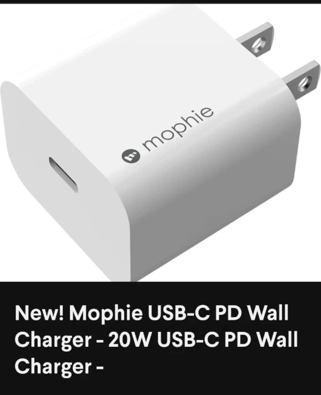 This is a new Mophie USB-C PD wall charger. It's a 20W charger with USB-C PD technology. Fast charging capabilities for your devices!