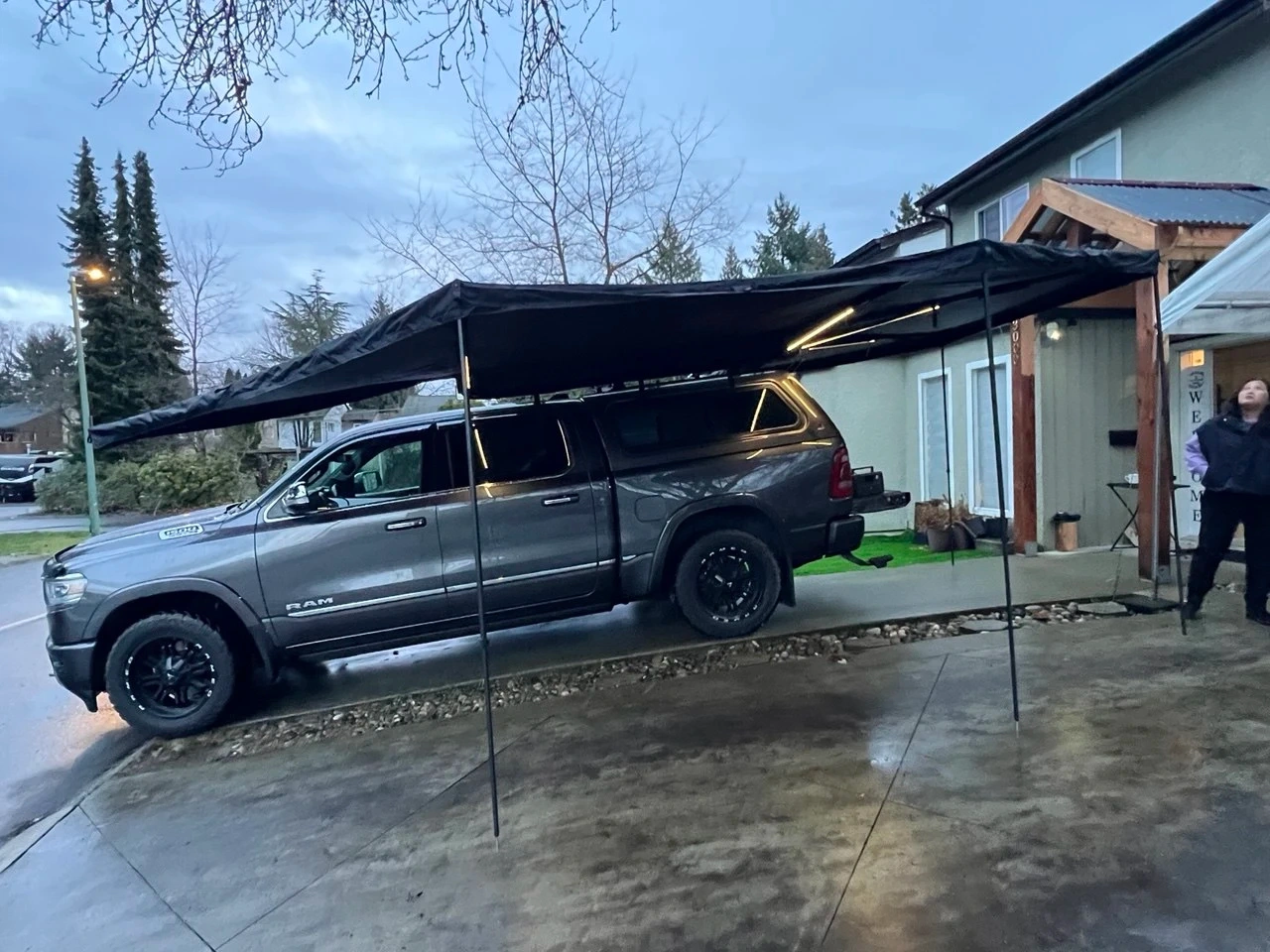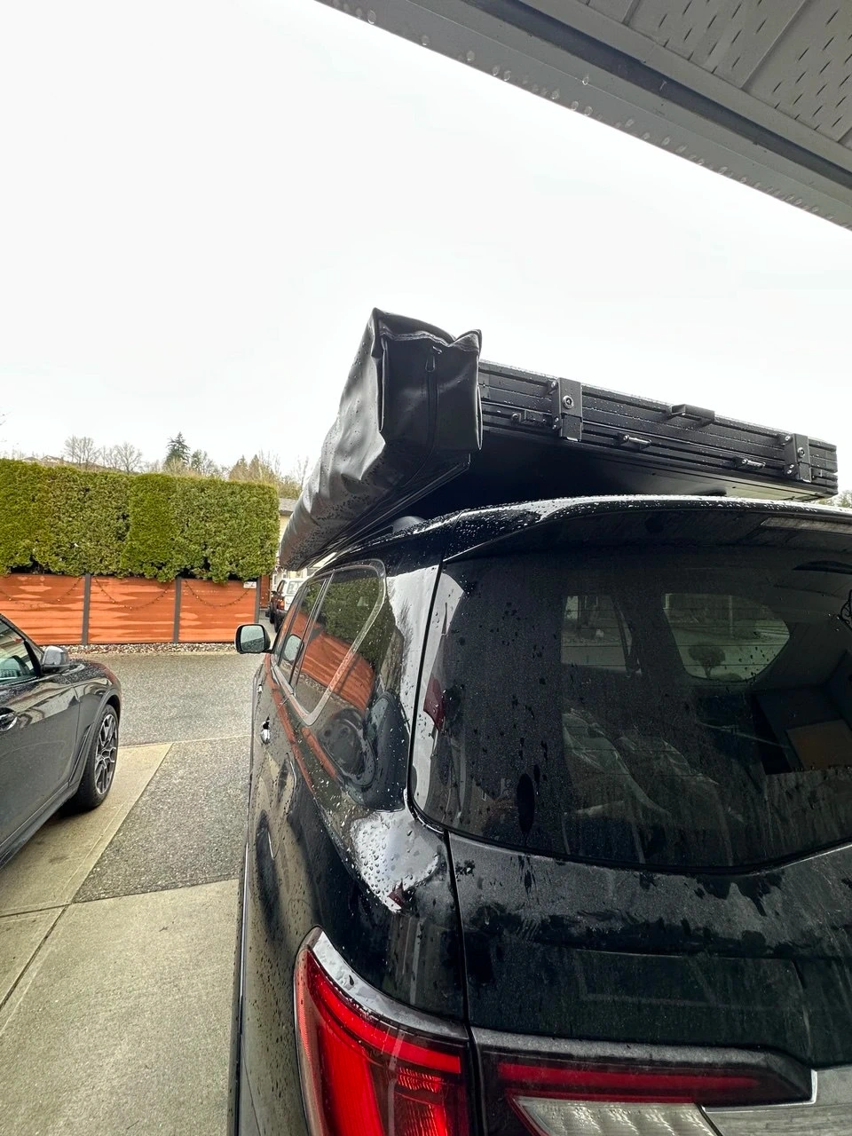 Selling a car roof awning in black. Can be freestanding or use the built-in black aluminum adjustable posts. It's brand new, never been used, and ready for your next outdoor adventure! Great quality! Perfect for camping or just enjoying some shade on the go