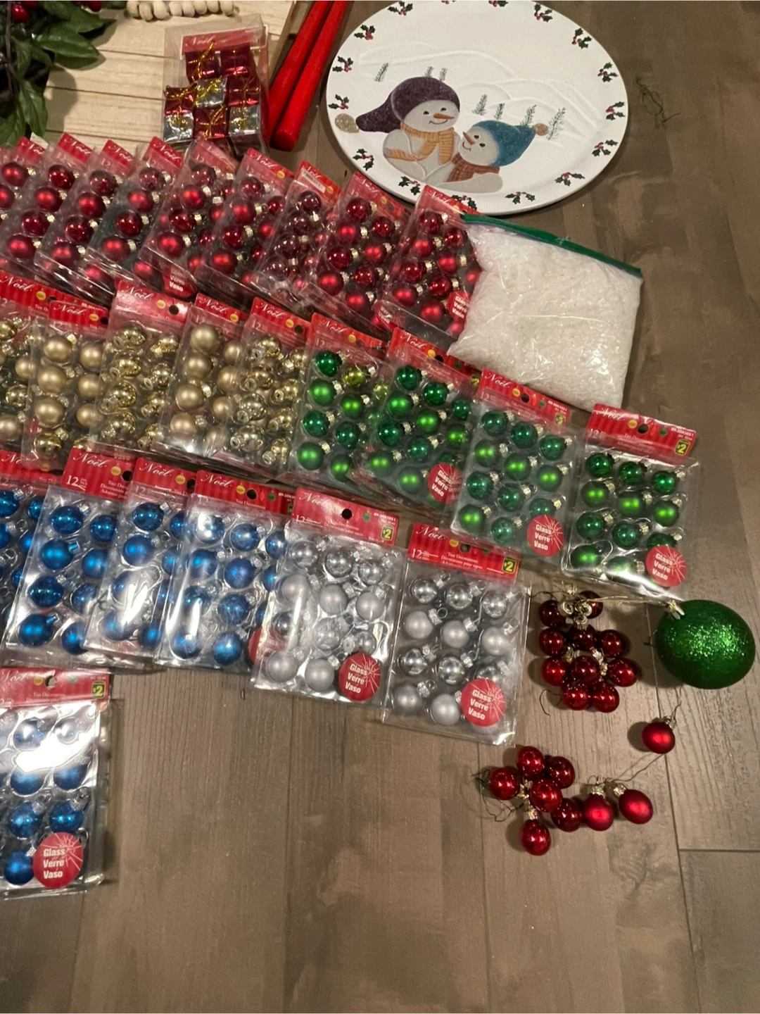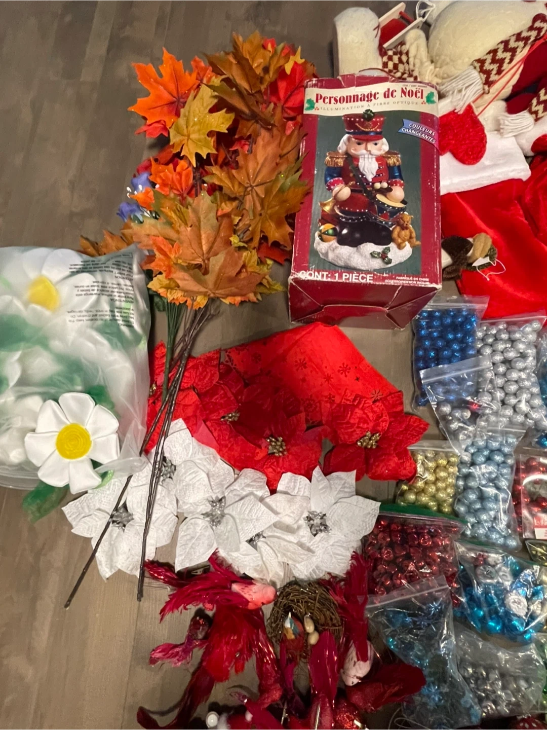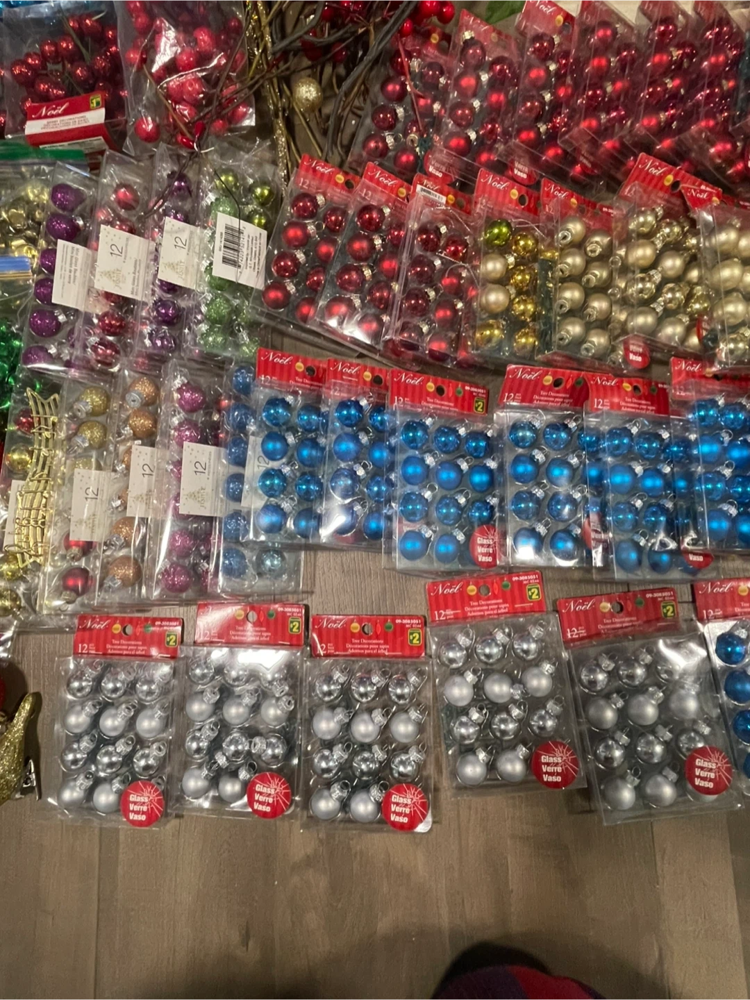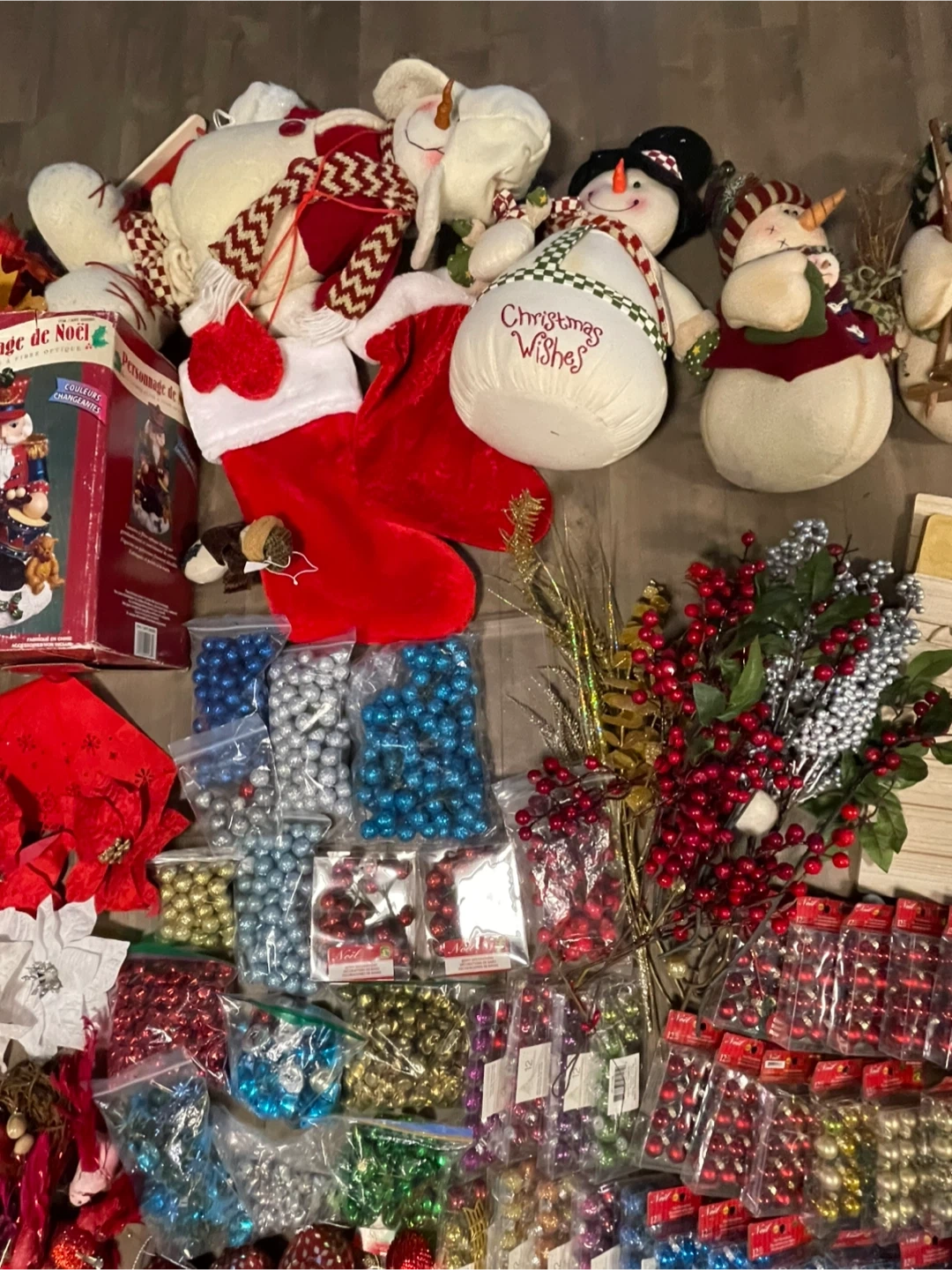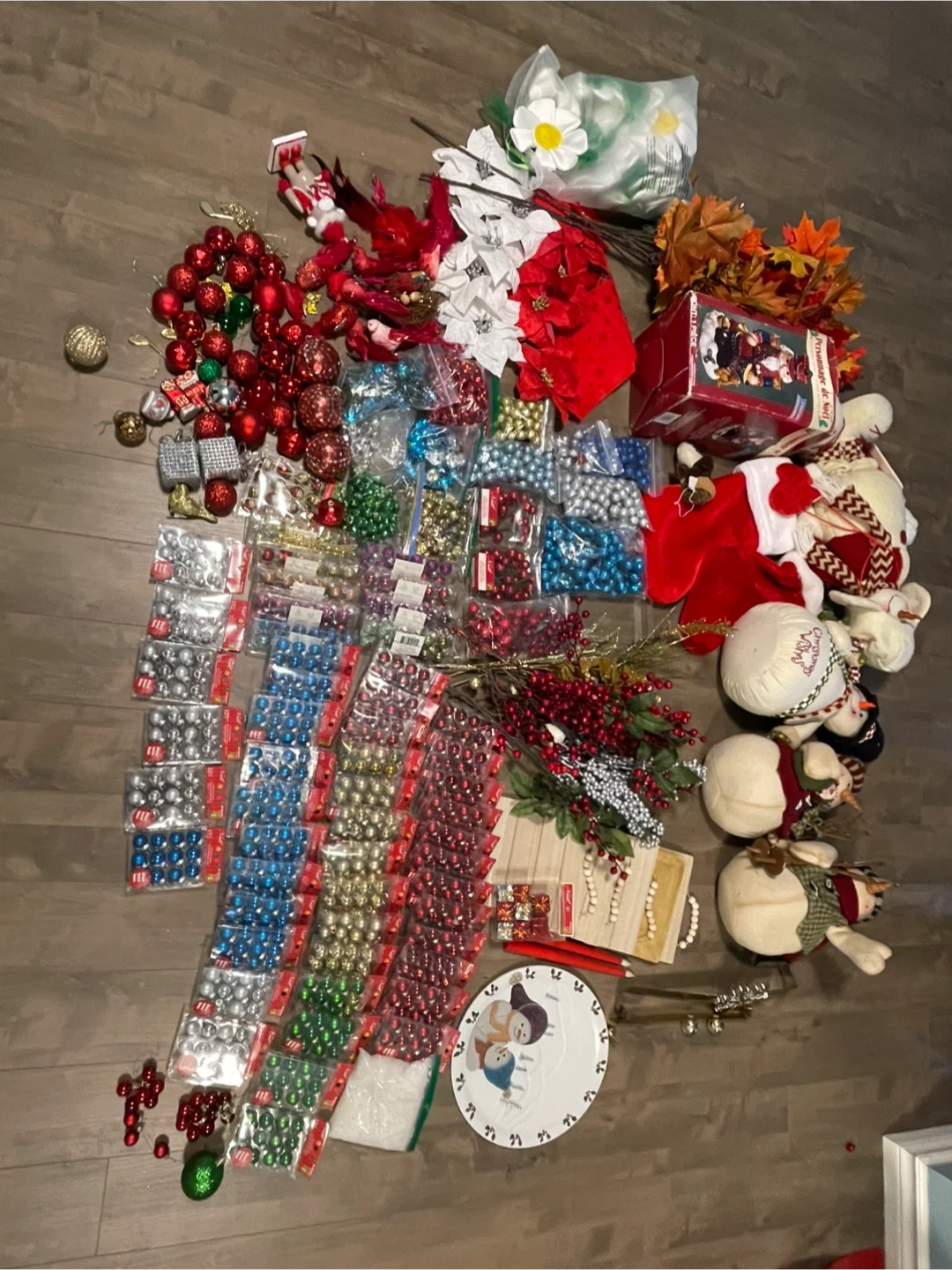 Massive collection of Christmas ornaments and decorations, including many packs of small baubles in red, gold, green, blue, and silver. Also includes decorative poinsettias, faux berries, fall leaves, and a festive Santa figurine. Plenty to deck out your tree and home this holiday season!