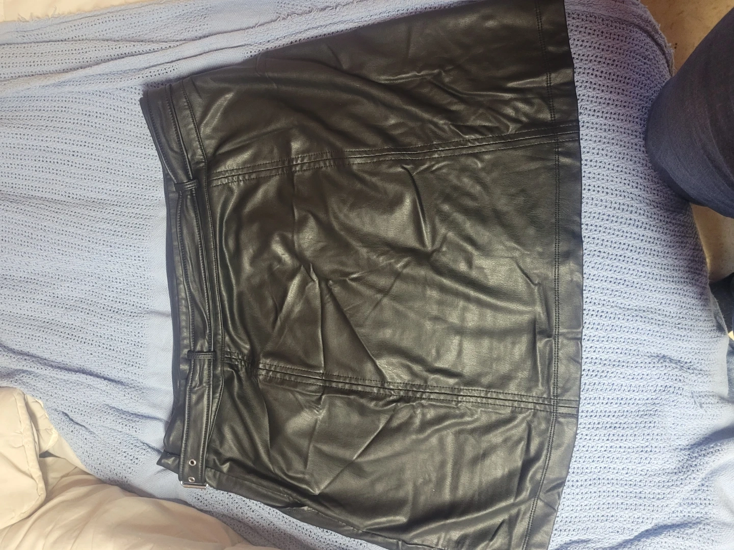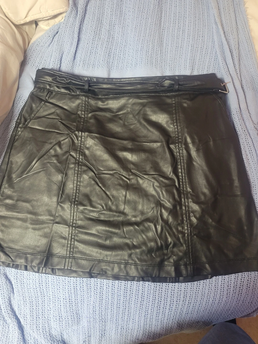 This is a black faux leather A-line skirt. It's made with a polyurethane coating and a polyester and spandex blend for comfort. It's a size XL. Great condition, no longer fits. Ir has been folded in a drawer.