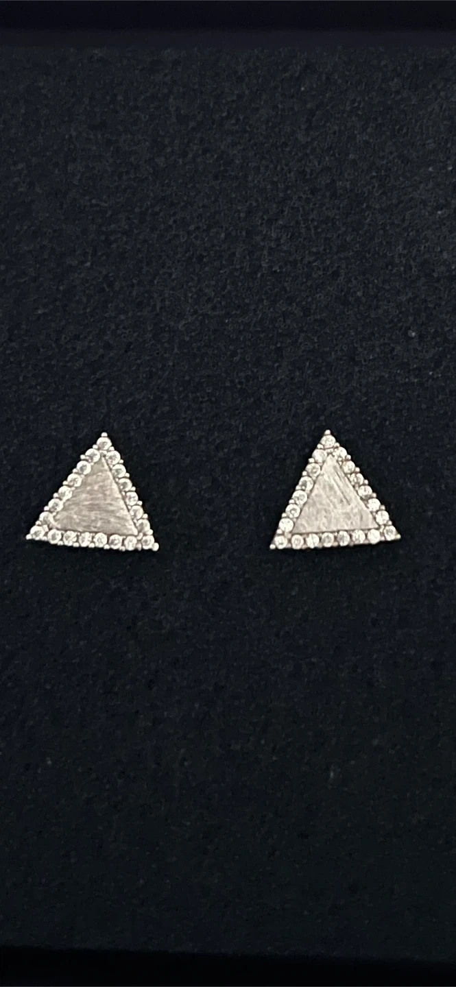 A pair of stylish triangle stud earrings adorned with sparkling Cubic Zirconia. They're crafted from a silver-toned metal and come in a gift pouch. These earrings add a subtle shimmer to any outfit! Virtually brand new.