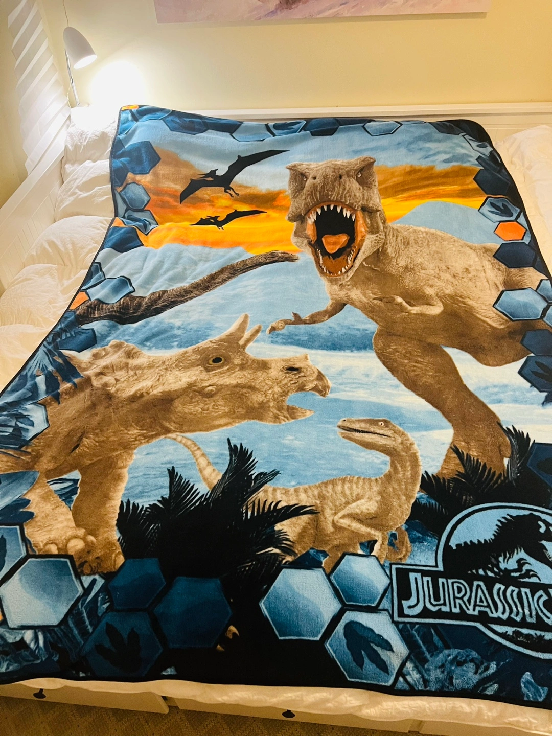 Soft fleece blanket. Features various dinosaurs, including a T-Rex, Triceratops, and Velociraptor. Blue, orange, and brown colour scheme. Jurassic World logo. Full size single bed. Cash and pick up only @Promenade Mall Check my other listings for a bundle. Thx