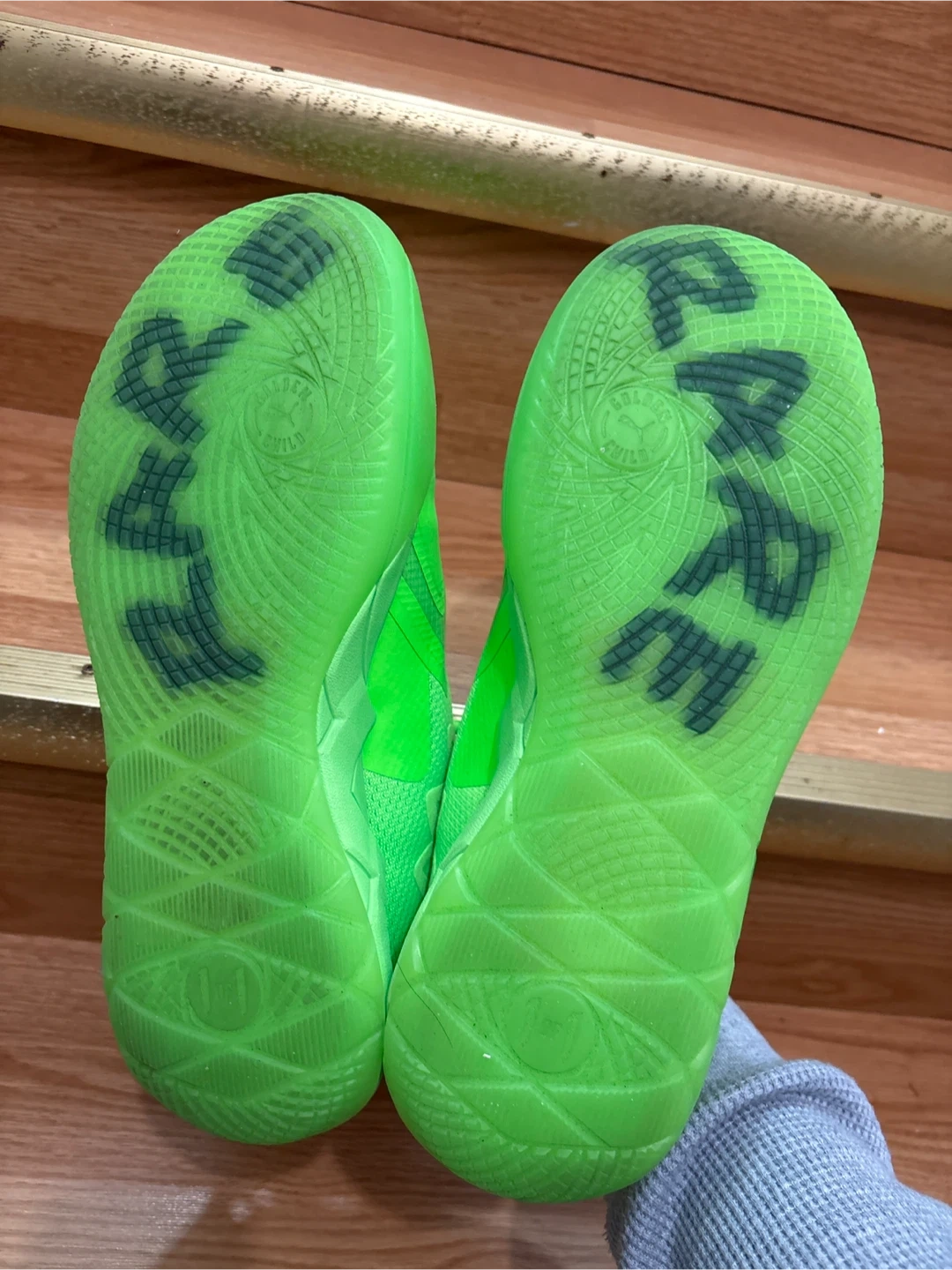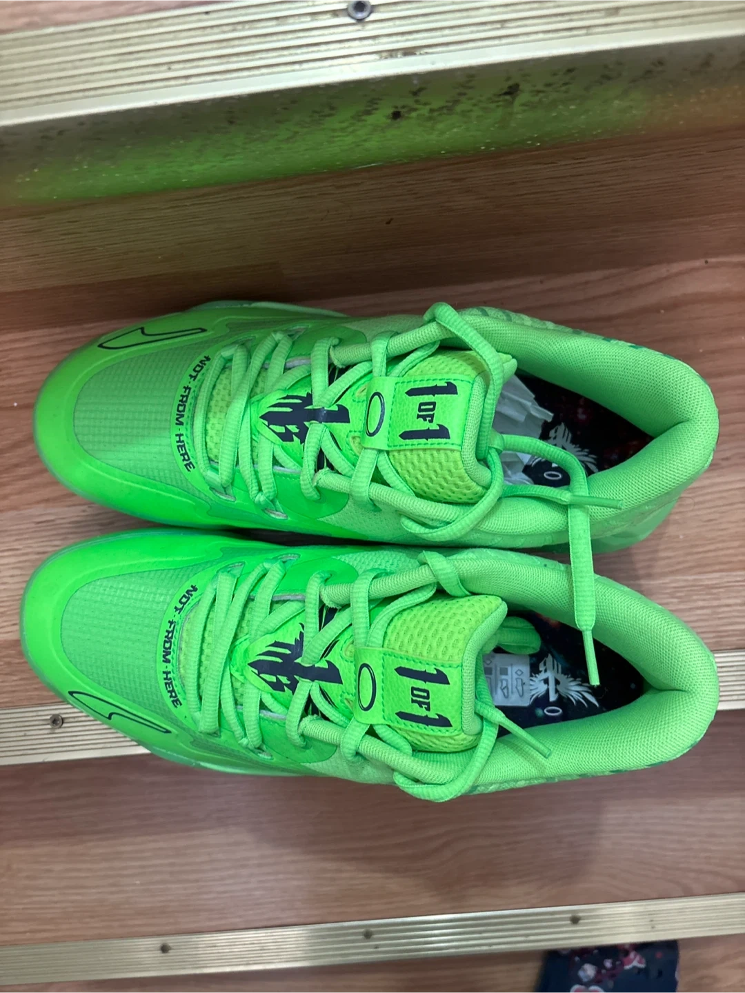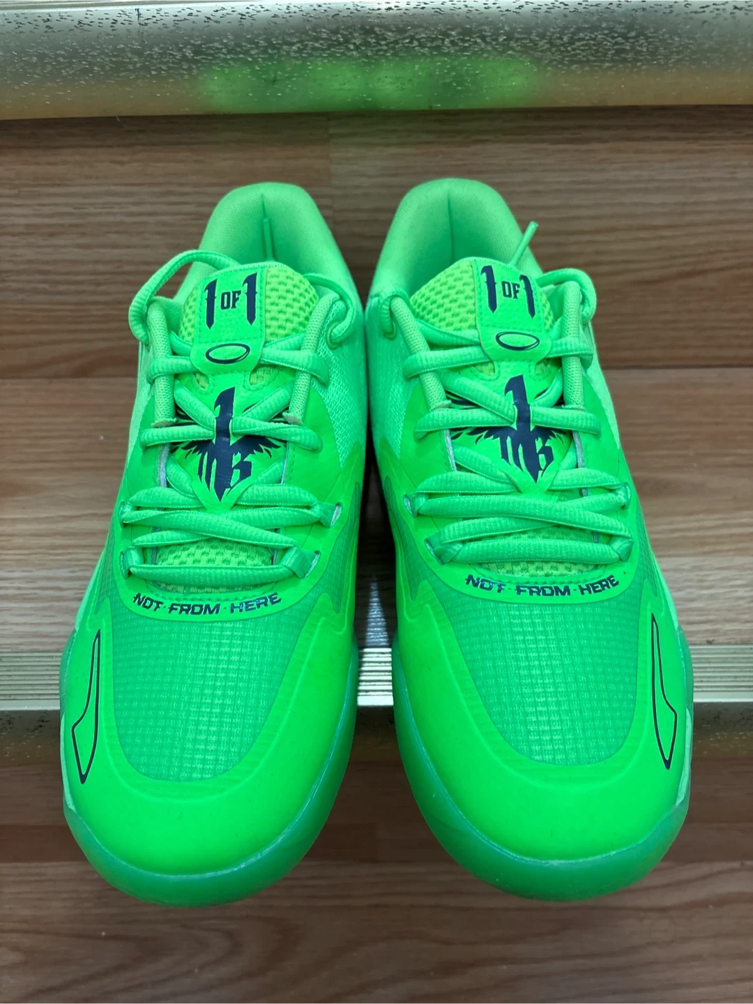 Puma MB.01 "Not From Here" basketball shoes in a vibrant neon green colour.