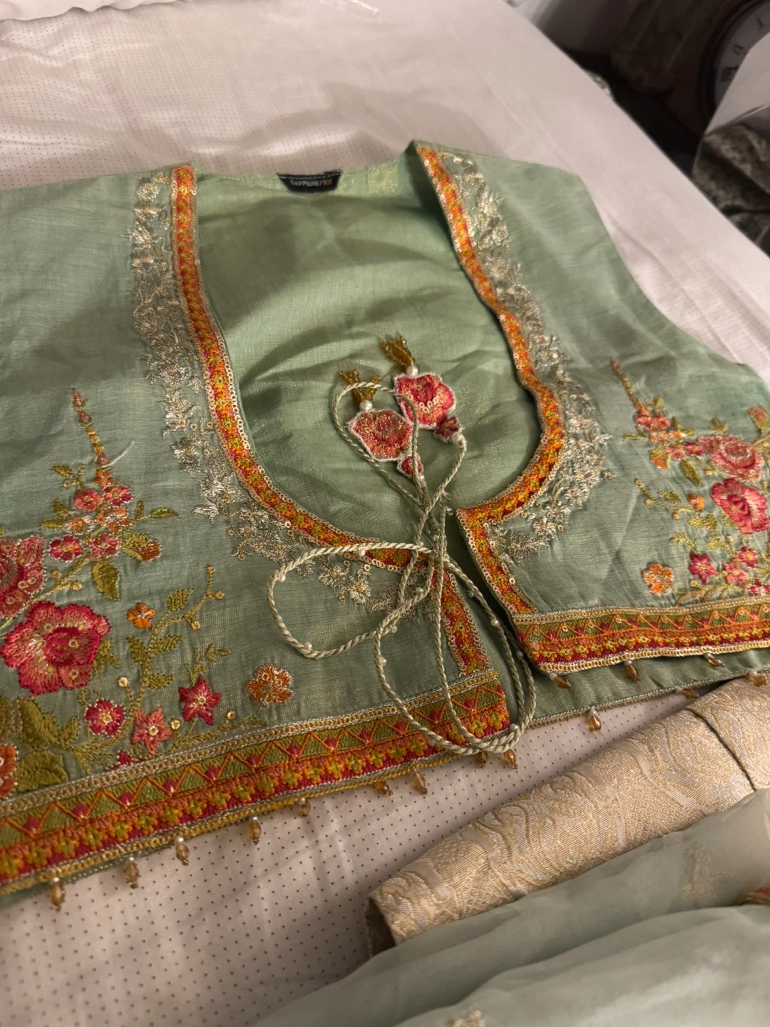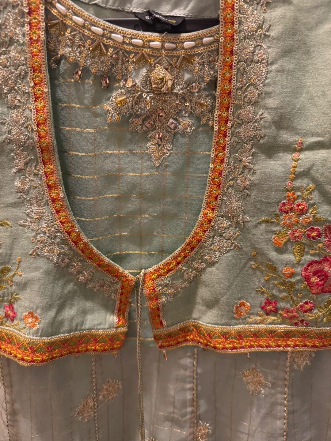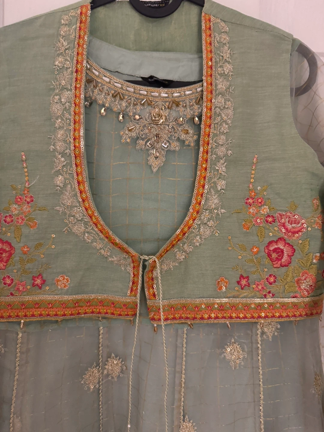 109Beautiful Pakistani suit in a lovely light green colour. The suit features intricate embroidery with chattapatti work on A line shirt with waist top and detailing, perfect for a special occasion. It includes the A line shirt (top), salwar (pants), and dupatta (scarf) with inner shirt and top embroidered waist shirt. Size is approximately small. From Sapphire Brand. Worn only once for an evening occasion.