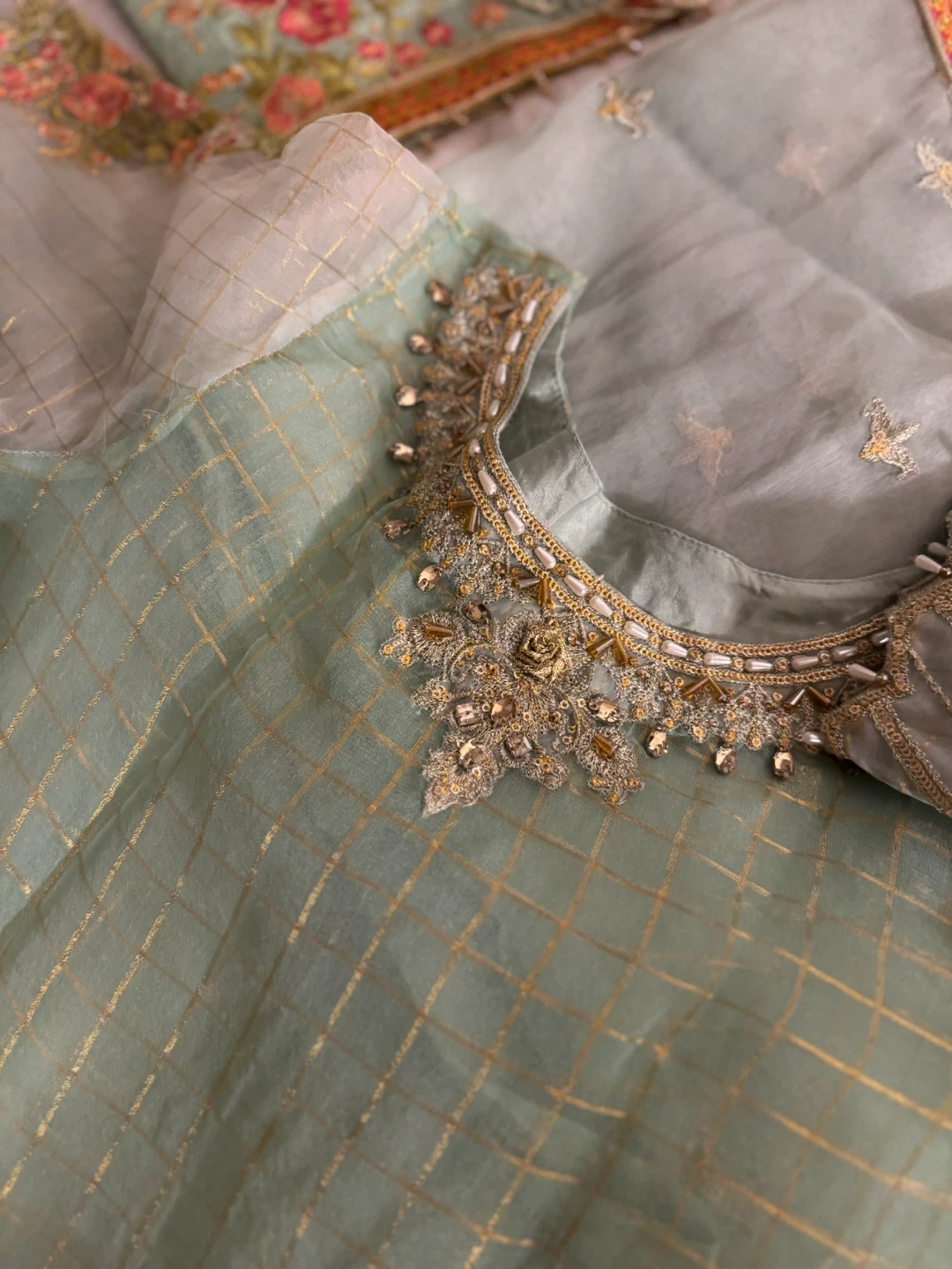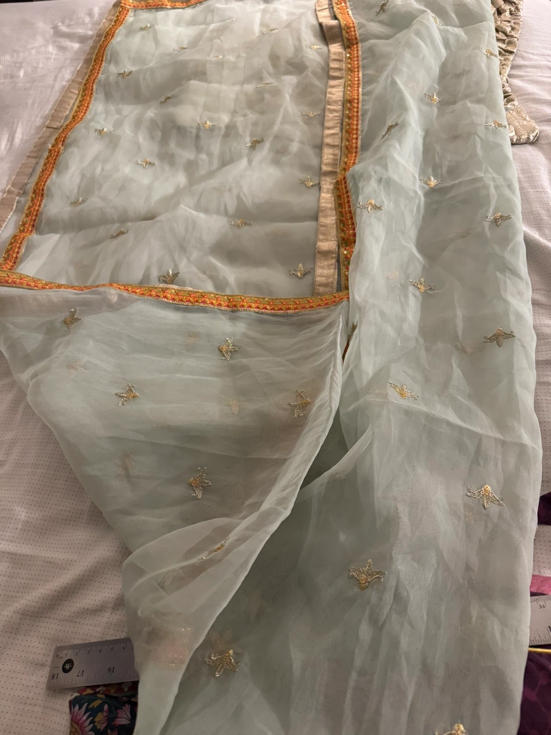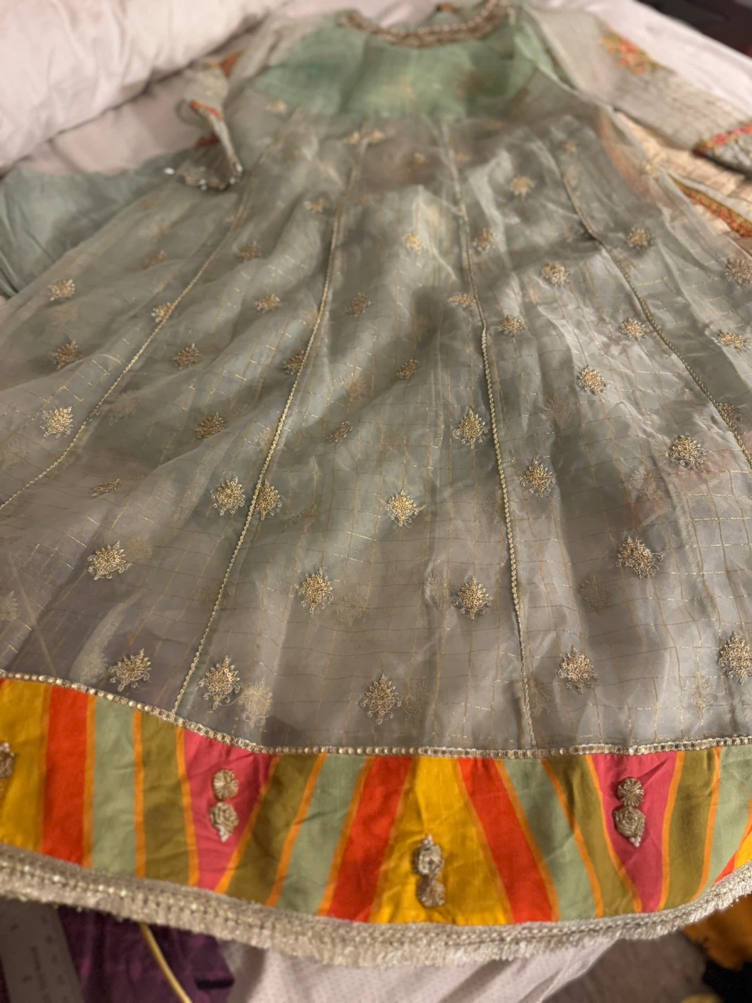 109Beautiful Pakistani suit in a lovely light green colour. The suit features intricate embroidery with chattapatti work on A line shirt with waist top and detailing, perfect for a special occasion. It includes the A line shirt (top), salwar (pants), and dupatta (scarf) with inner shirt and top embroidered waist shirt. Size is approximately small. From Sapphire Brand. Worn only once for an evening occasion.