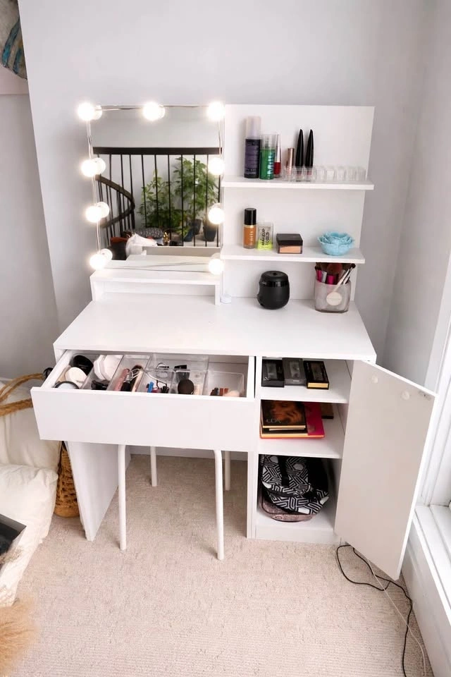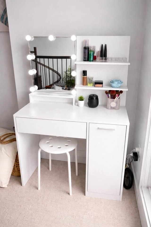 Elevate your space with this sleek, all-white makeup vanity. Perfect for getting ready, filming content, or adding a clean aesthetic to your room.