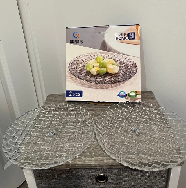 Large round crystal glass serving plates with a beautiful weave design. Set of 2. Each plate measures 10" (25.5 cm). These are brand new and still have their original stickers!