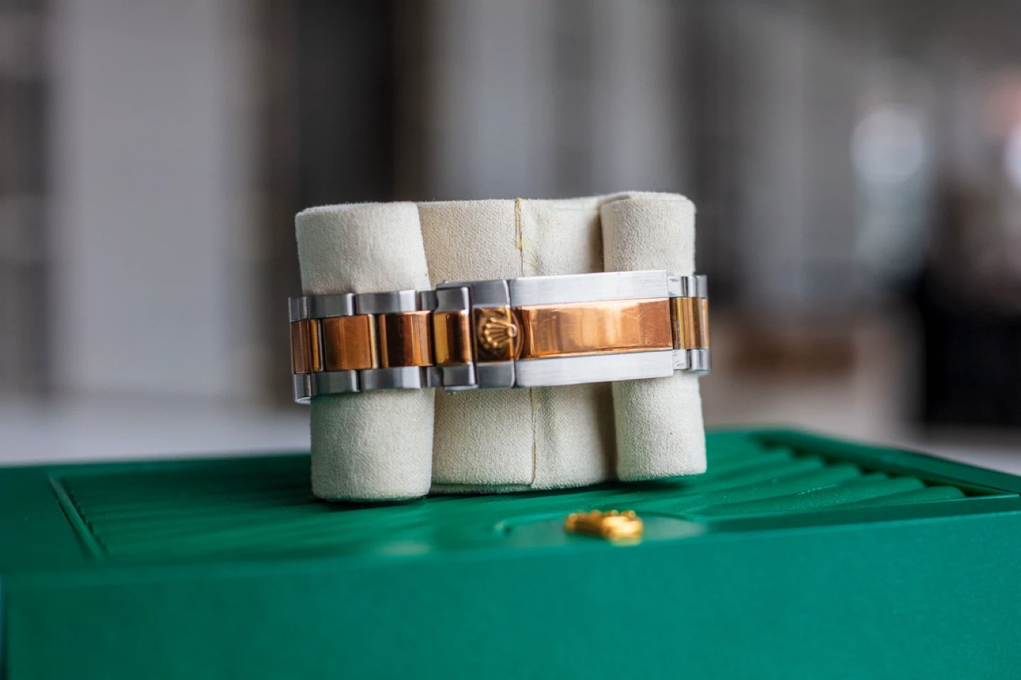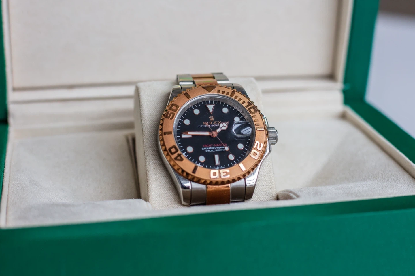 A Yacht-Master watch, two-tone stainless steel and rose gold. Includes box. Automatic movement with date complication.