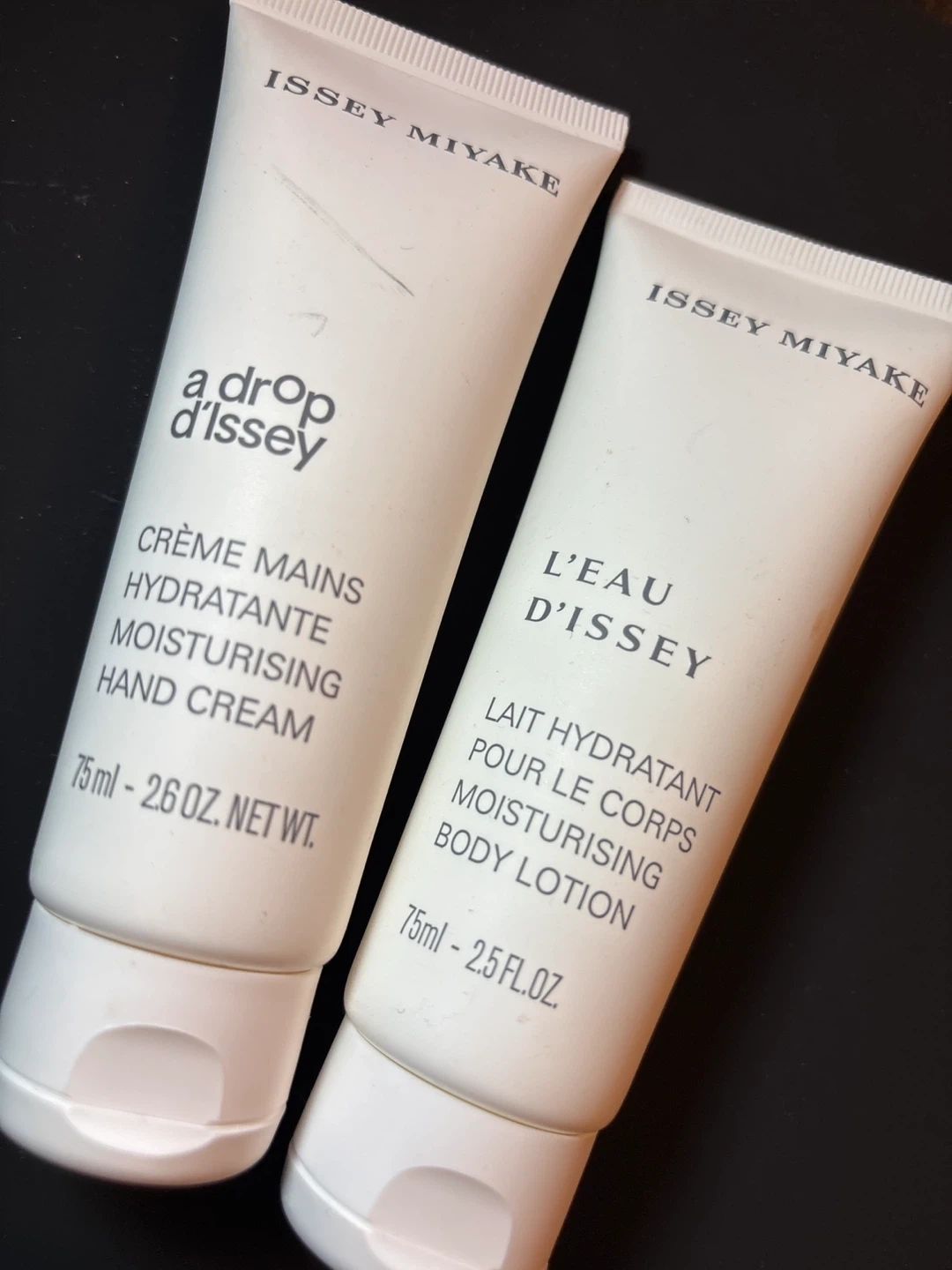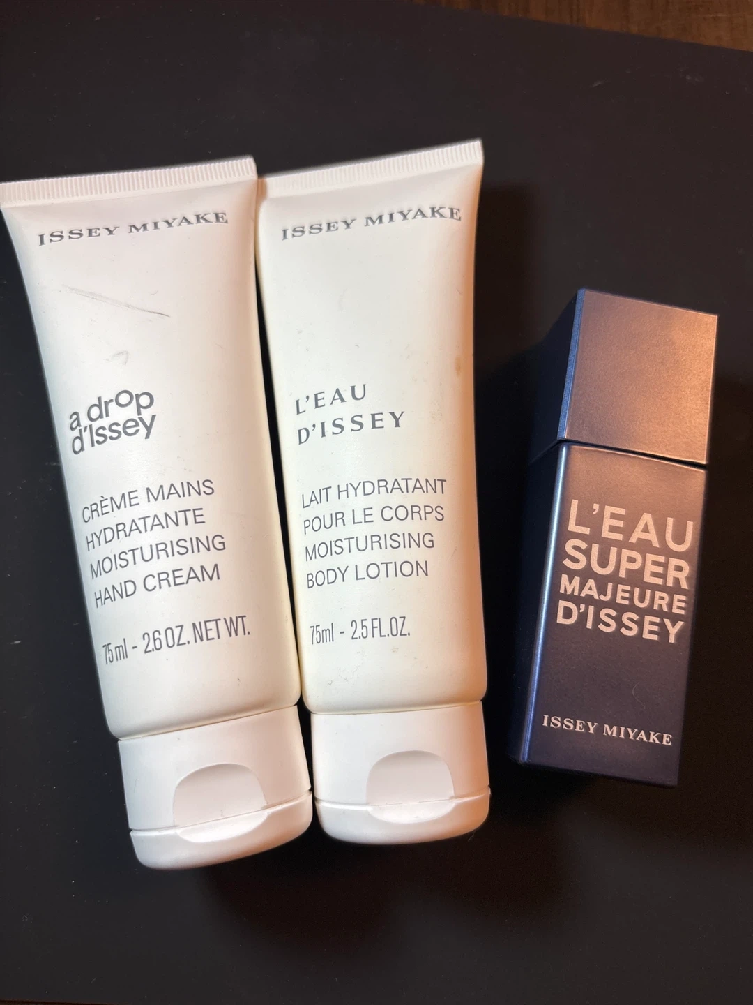 This set includes Issey Miyake L'Eau Super Majeure D'Issey Eau de Toilette intense 20ml, a 75ml moisturising hand cream, and a 75ml moisturising body lotion. The hand cream is "a drop d'issey" and the body lotion is "L'eau d'issey".