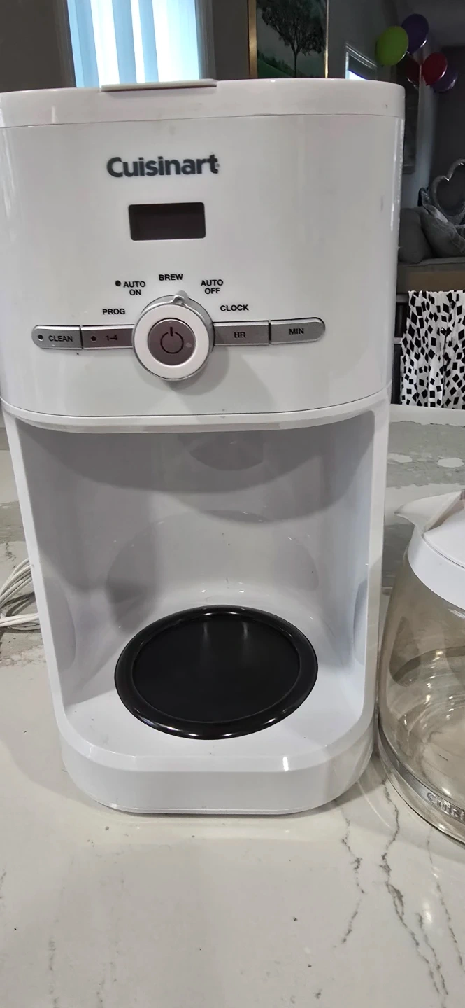 This is a white Cuisinart coffee maker. It has a carafe with measurement markings up to 12 cups. Features include auto-on, brew, clock, and min functions.brand new just open to check on it