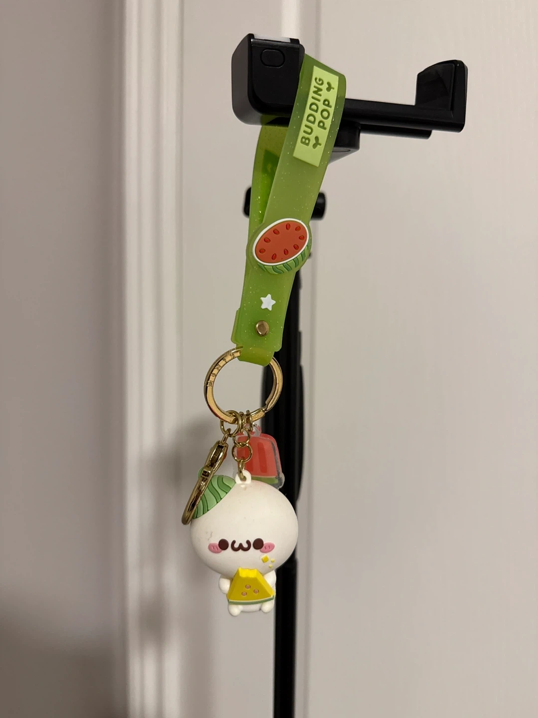 This Budding Pop keychain features a charming character holding a slice of cheese. It's made of durable material and comes with a playful watermelon charm. Perfect for adding a touch of fun to your keys or bag!