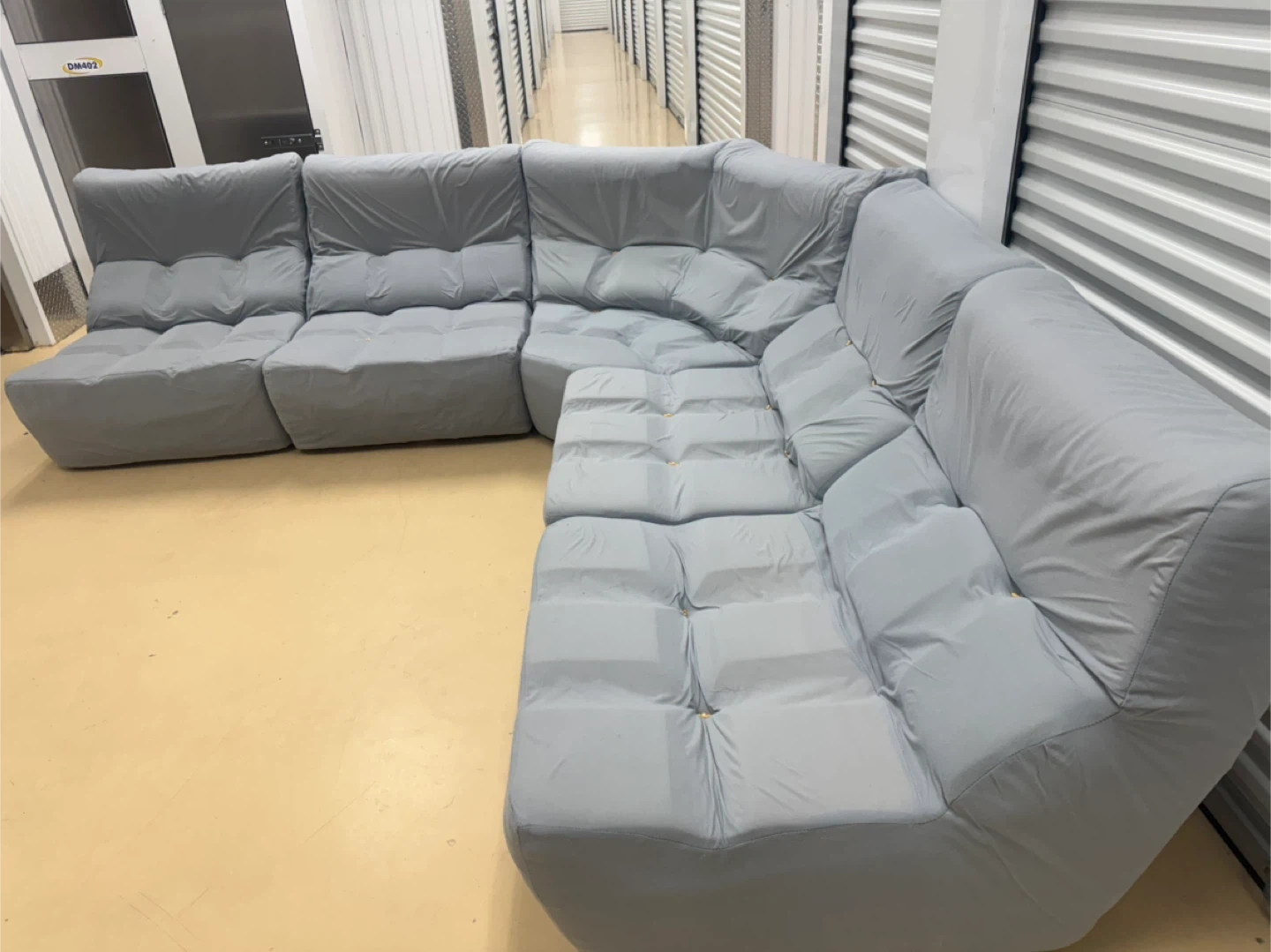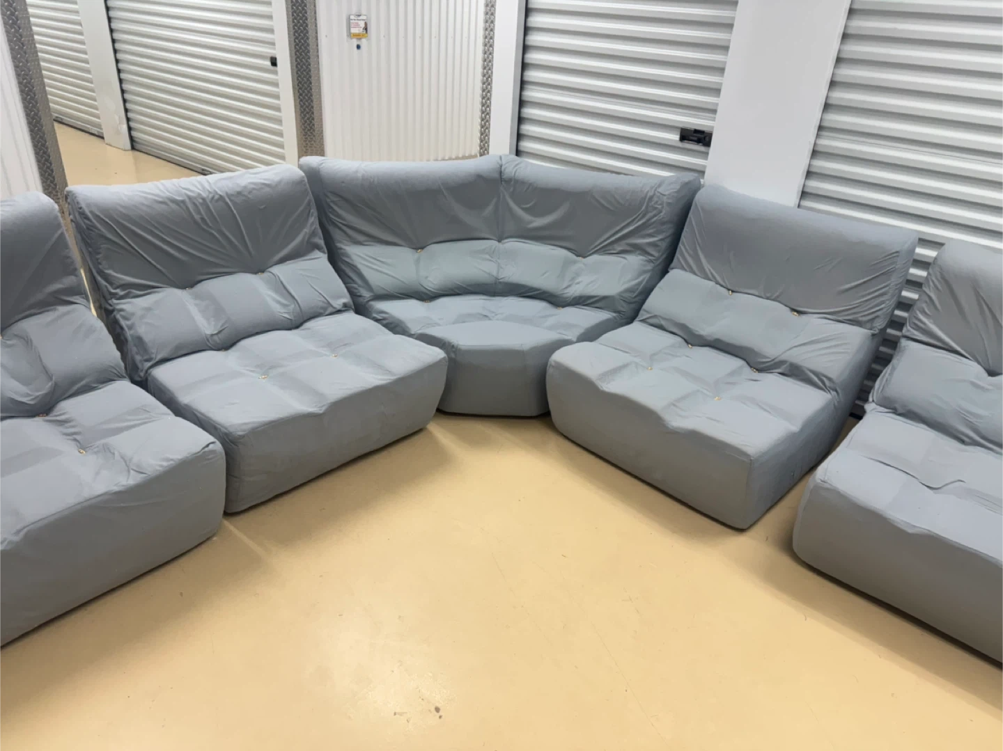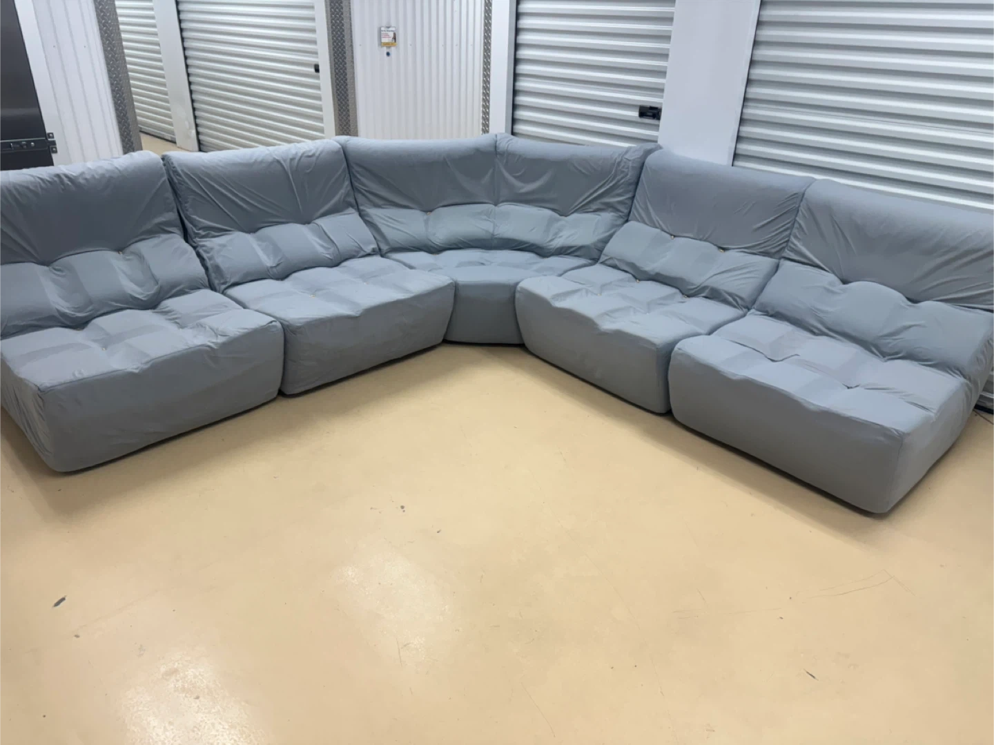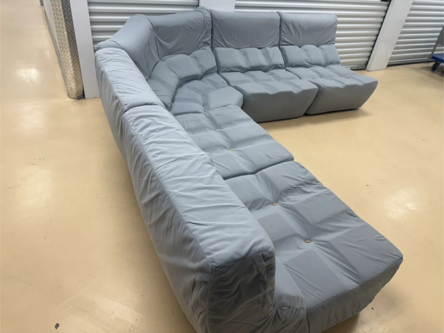 This is a grey sectional sofa with tufted cushions. It's made of fabric. It's a modular piece, great for configuring to fit your space! Good condition home delivery available