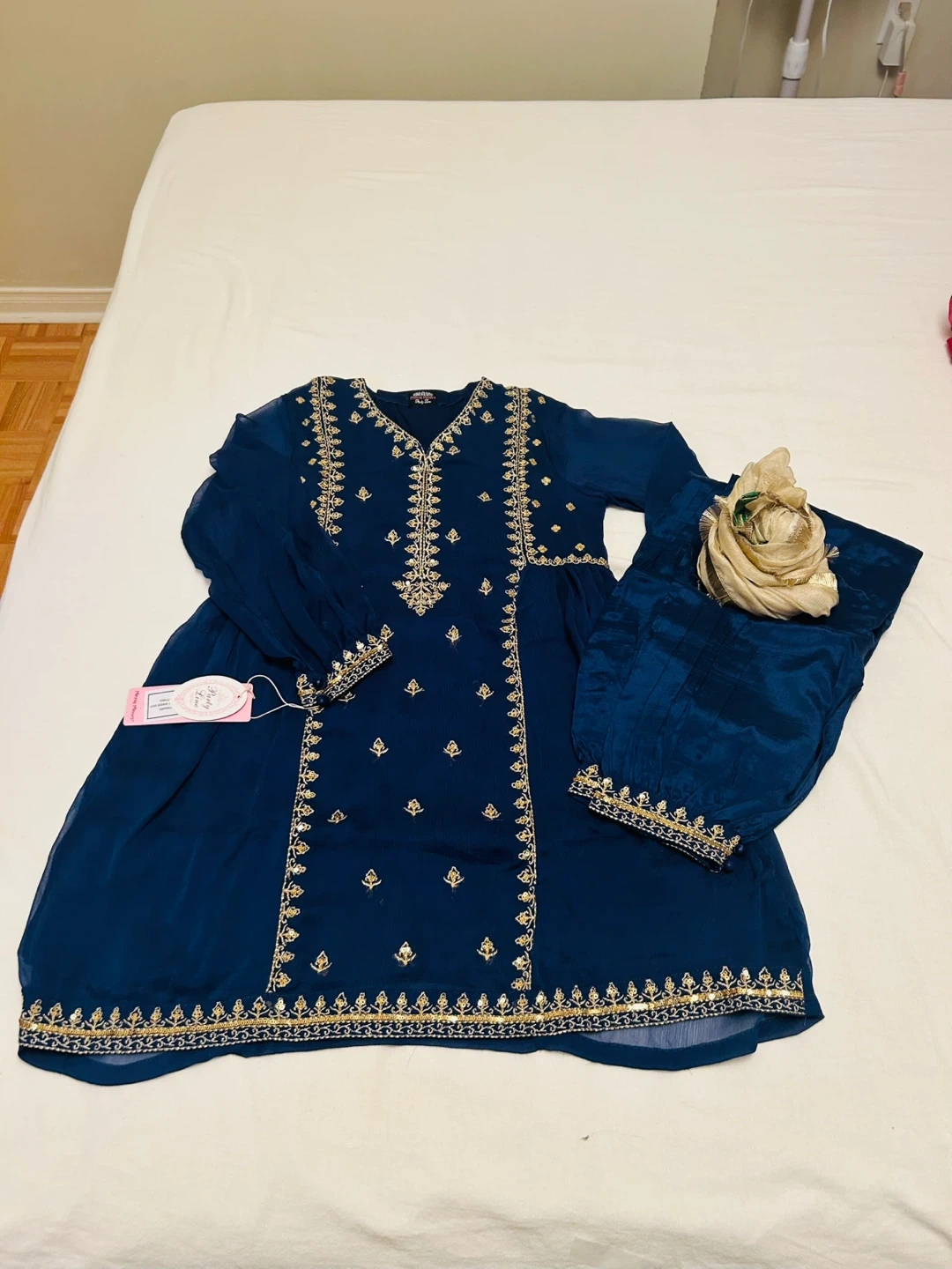 This is a beautiful embroidered blue kurti set. It features intricate gold thread work all over the kurti and matching pants. The fabric is lightweight and perfect for special occasions. It comes with a coordinating dupatta.