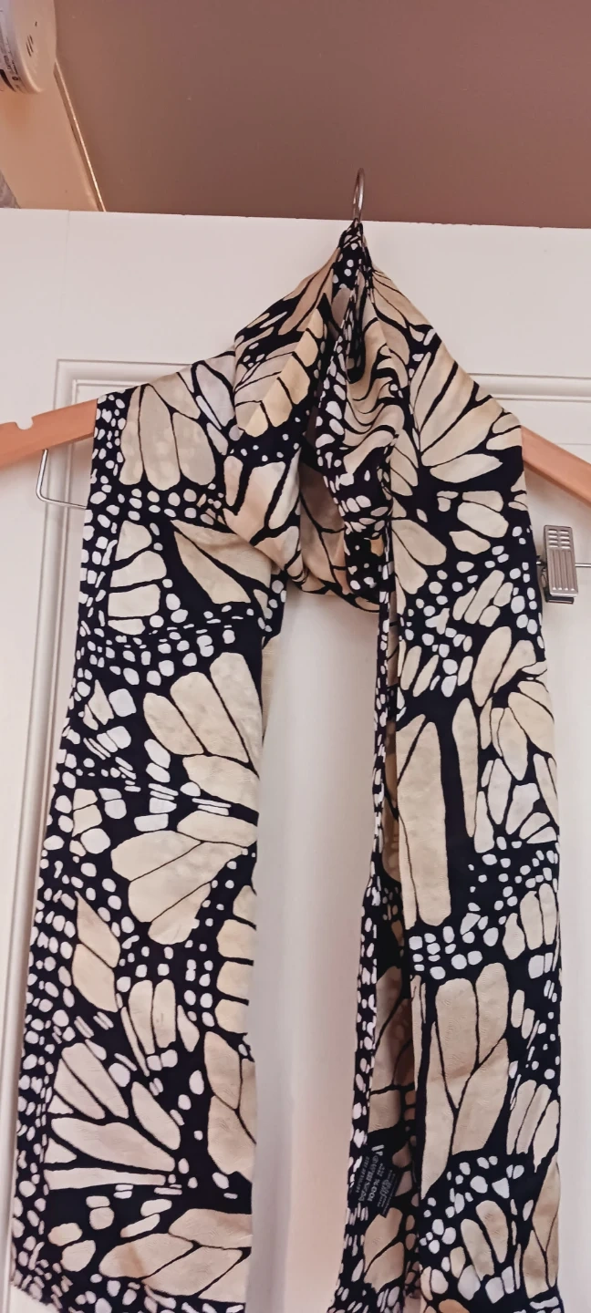 PINEDA COVALIN MEXICAN DESIGNER SIGNED AUTHENTIC 100% SILK ABSTRACT DESIGN SCARF. THIS STRIKINGLY BEAUTIFUL SCARF FROM PINEDA COVALIN DEPICTS ABSTRACT MACRO MONARCH BUTTERFLY DESIGN IN BLACK & BEIGE COLOR.It features a unique butterfly design in black and beige. The material is pure silk and it feels luxurious to the touch. It's in great condition and ready to add a touch of elegance to your wardrobe !! 70"×10". Made in Mexico. Excellent condition, like new. ALL MY PRICES ARE NEGOTIABLE !!!