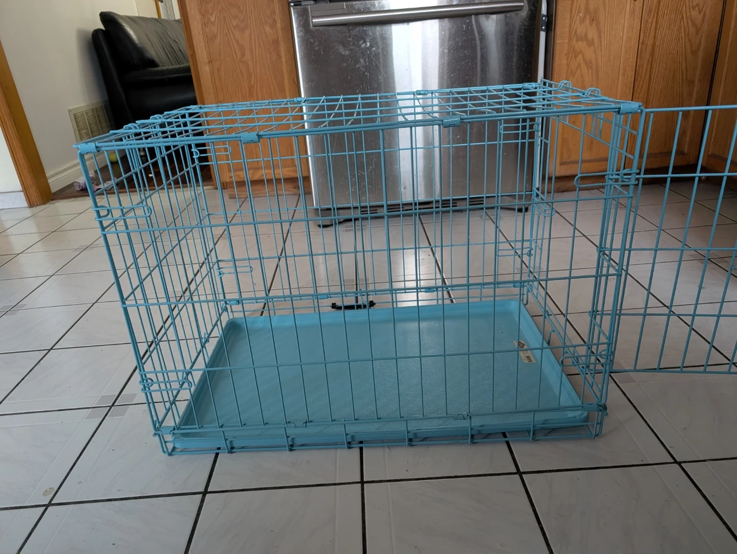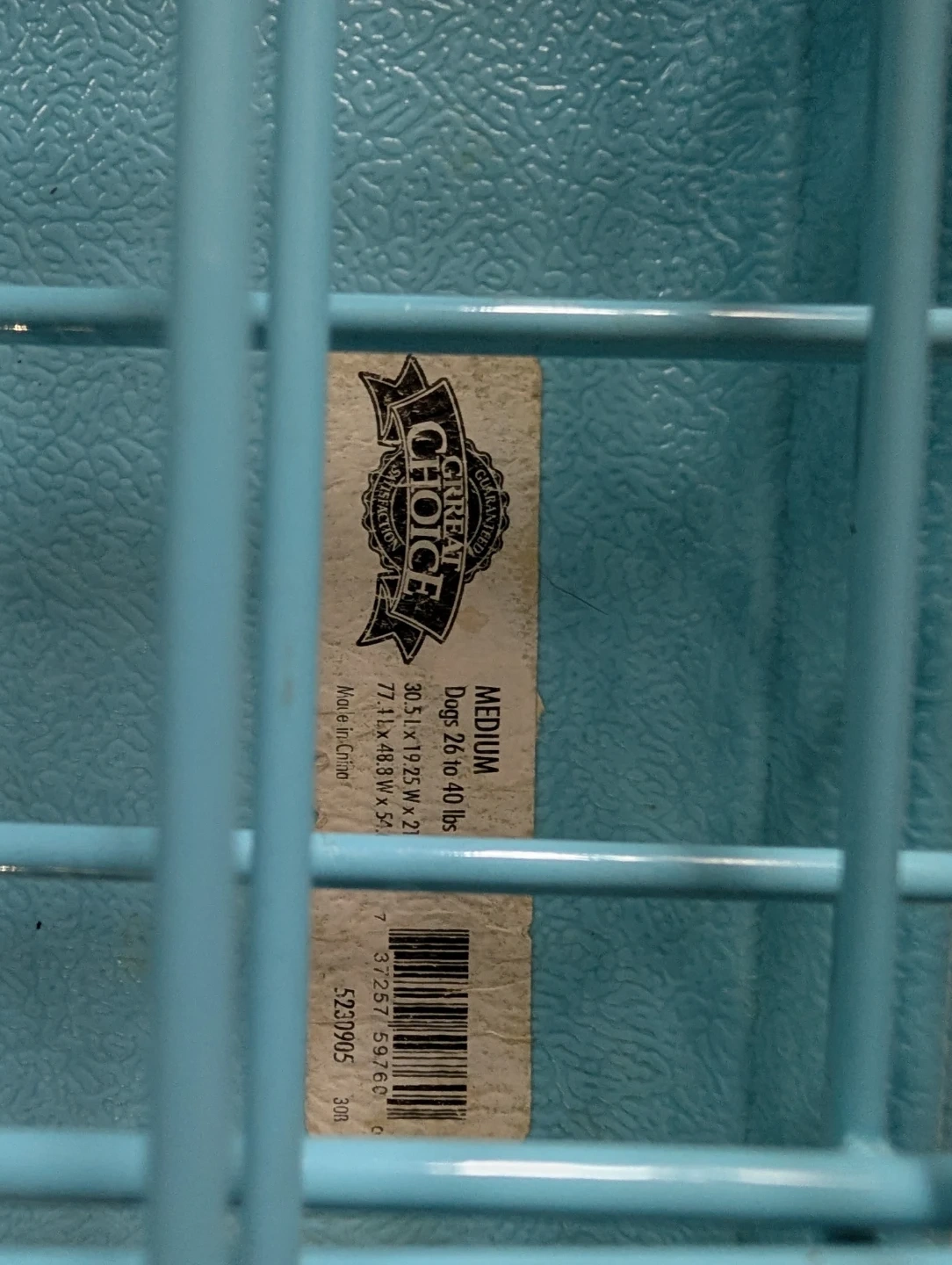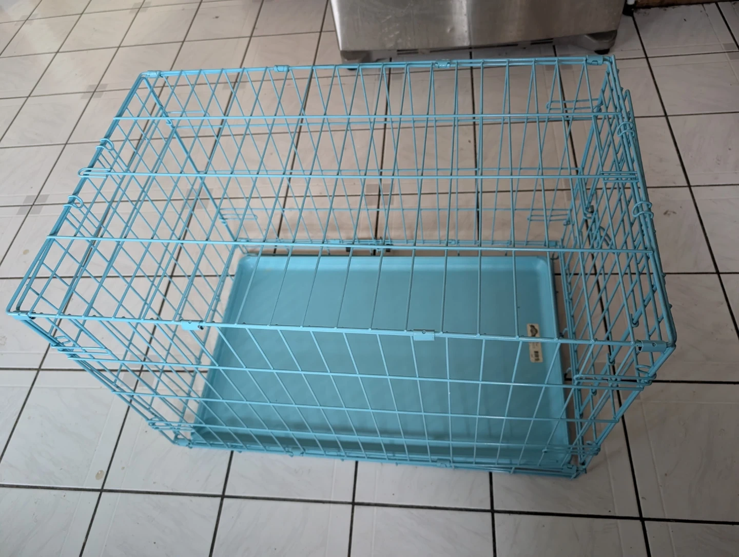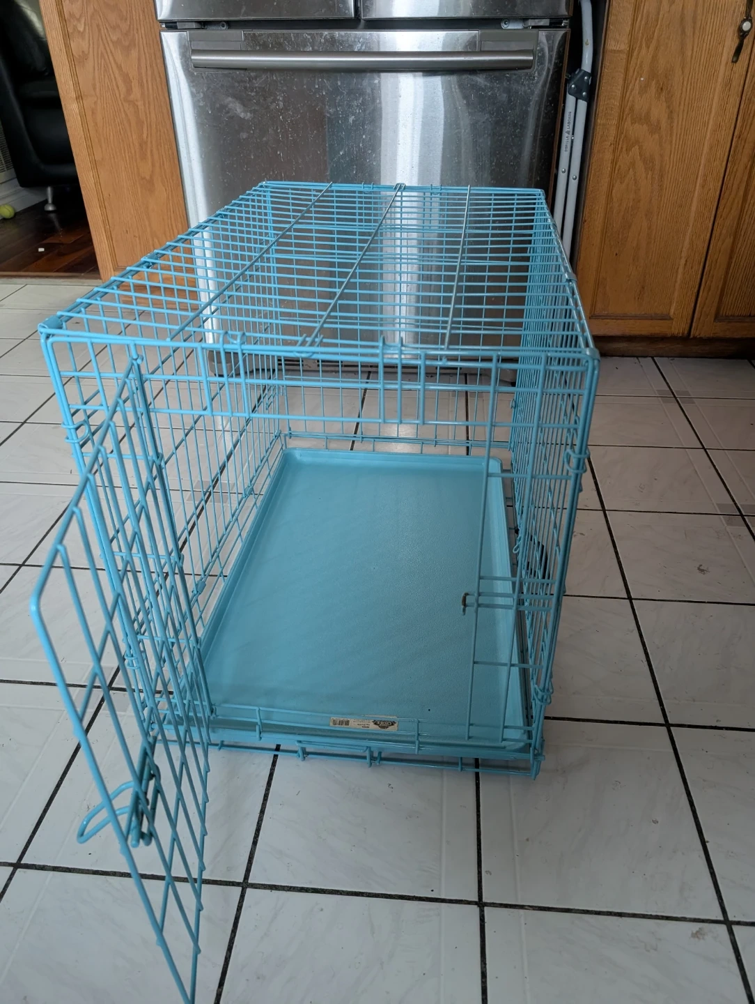 This is a medium-sized metal dog crate from Great Choice. It's blue and includes a plastic tray. Designed for dogs 26 to 40 lbs. It's portable and can be put closed away when not in use. It features a handle for easy transportation.