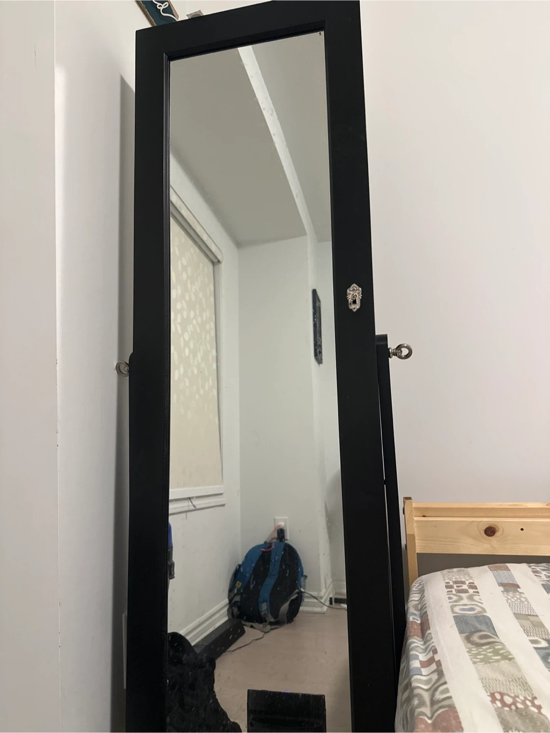 This is a full-length standing mirror with a black frame. It's designed to also function as a jewelry armoire. It opens to reveal storage for your accessories.