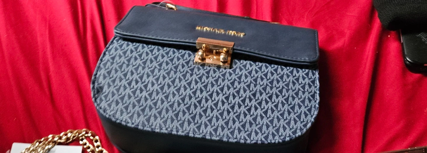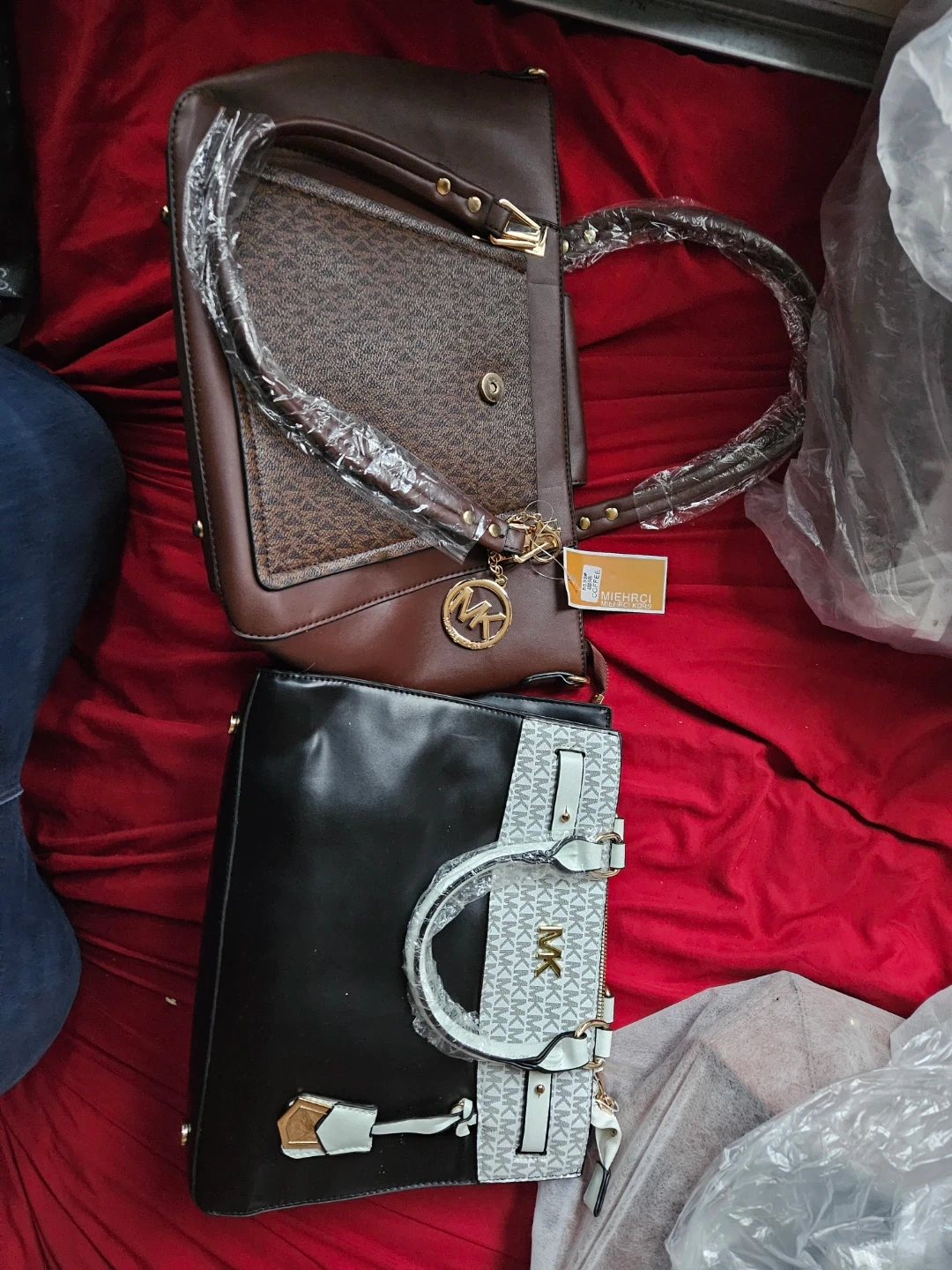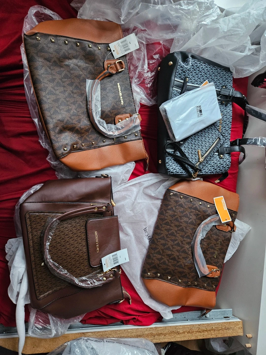 A collection of Michael Kors handbags in various styles and colours. Includes tote bags and crossbody styles. Some bags feature the signature MK pattern with gold-tone hardware.