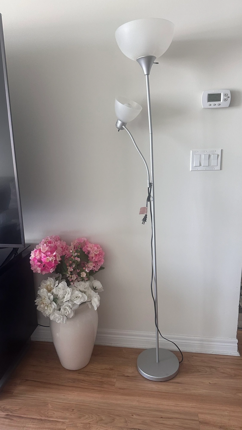 Floor lamp with two lights. The lamp is silver in colour and has two white frosted glass shades. It has a flexible arm, making it perfect for reading.
