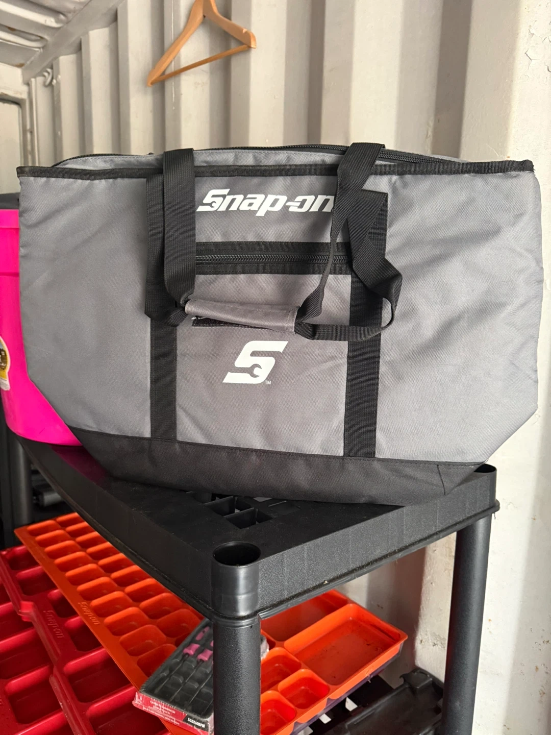 Grey Snap-on insulated cooler bag. Outer material: 600D. Inner lining: PEVA Heat Sealed. Great for keeping items cool or warm!