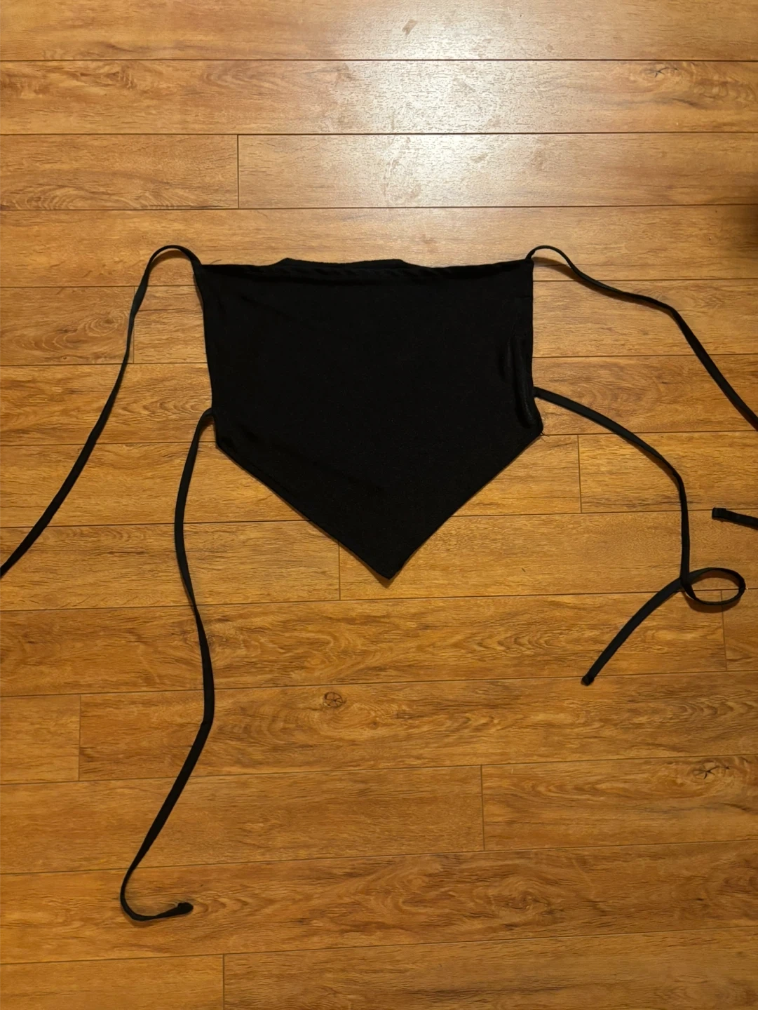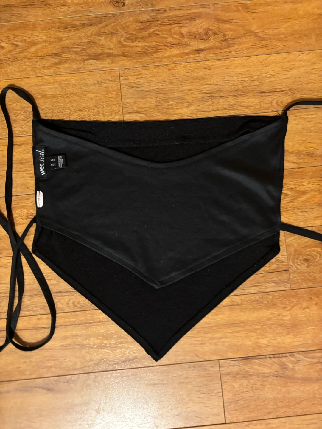This is a black bandana halter neck top from Wet Seal. It's a size medium with tie closures for an adjustable fit. The material is soft and stretchy for comfort.