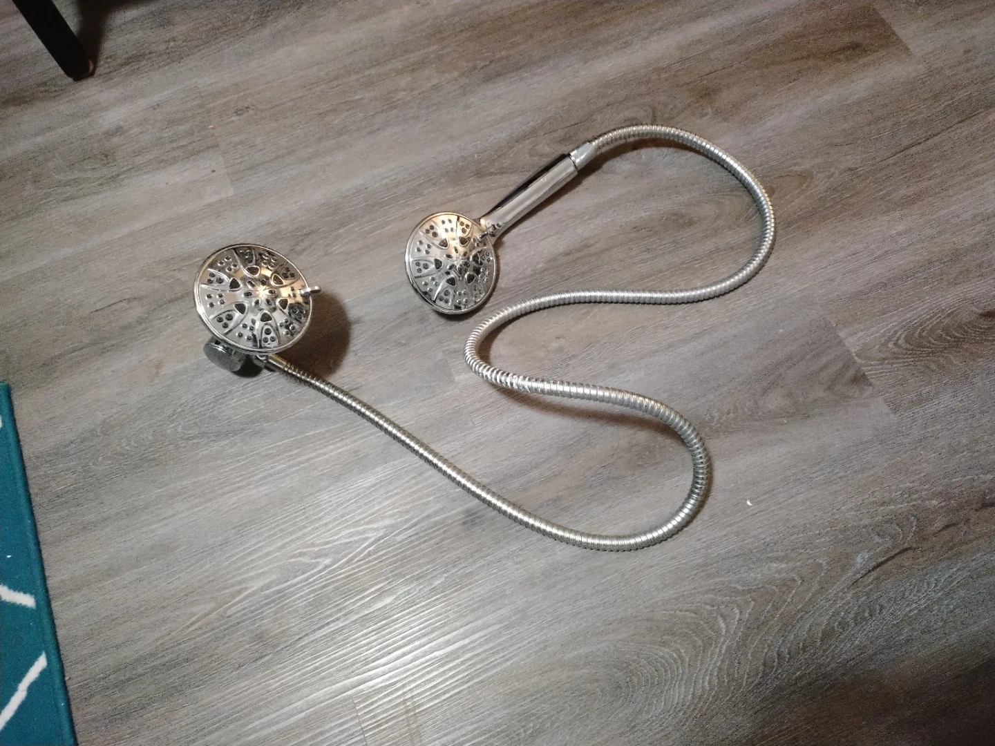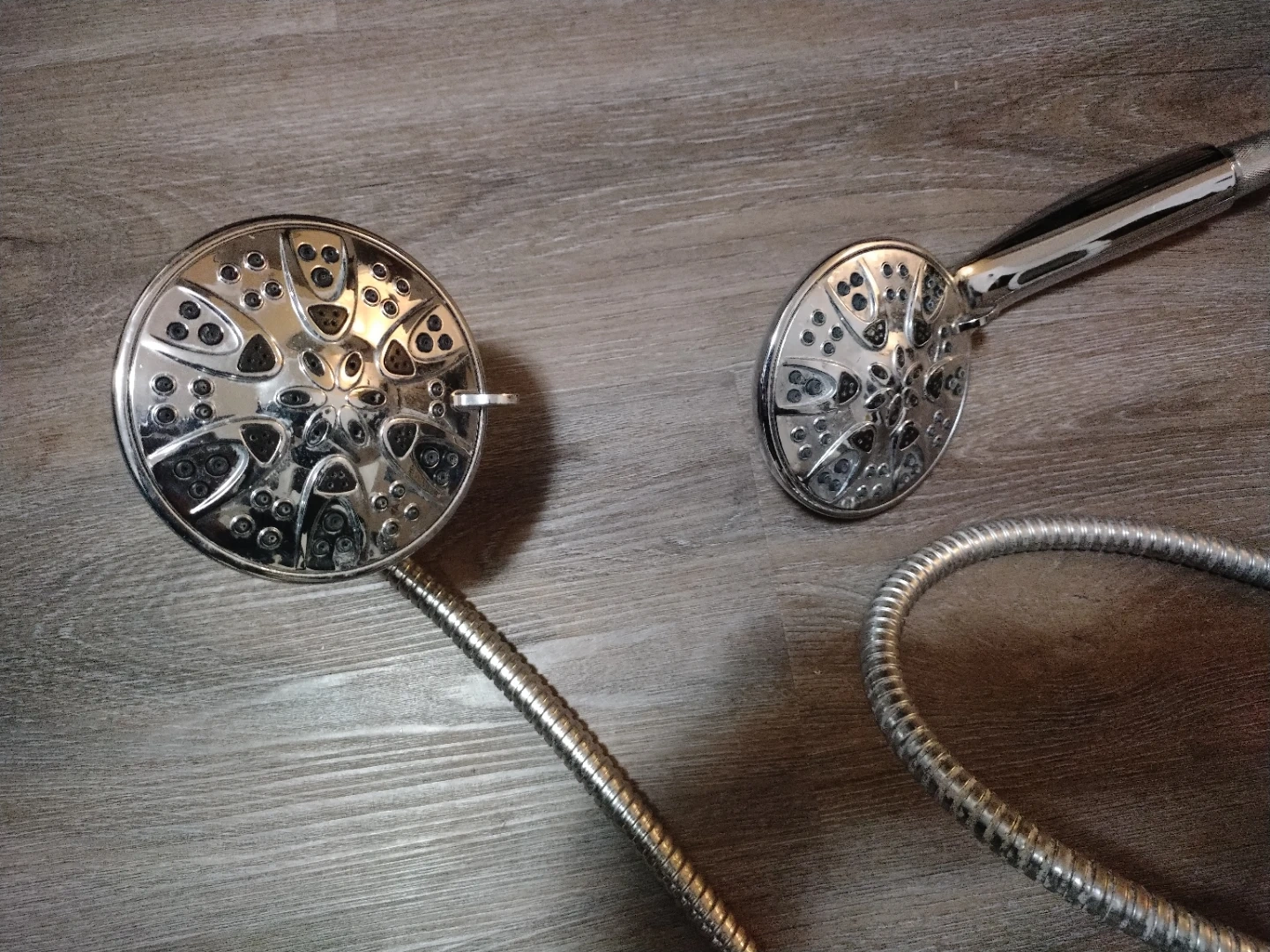 This is a handheld shower head set with a flexible hose. It's made of metal and has a chrome-like finish. The set includes two shower heads, one large and one smaller, connected by a long hose.