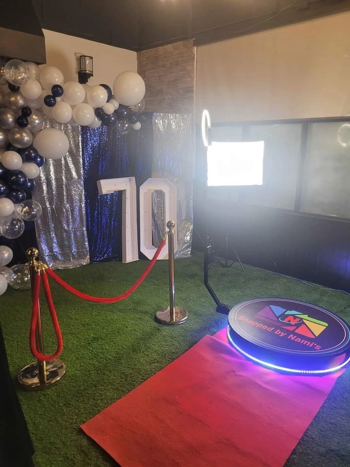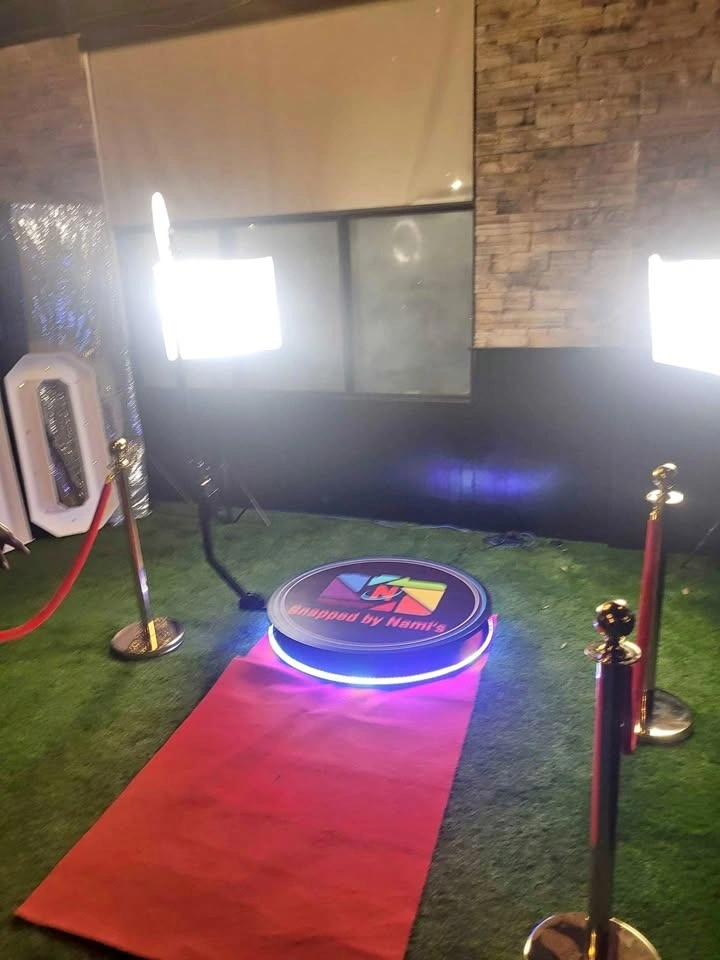 Looking to rent a 360 LED photo booth for your event? Our booth can accommodate up to 6 people and features changing LED colors, perfect for any occasion.