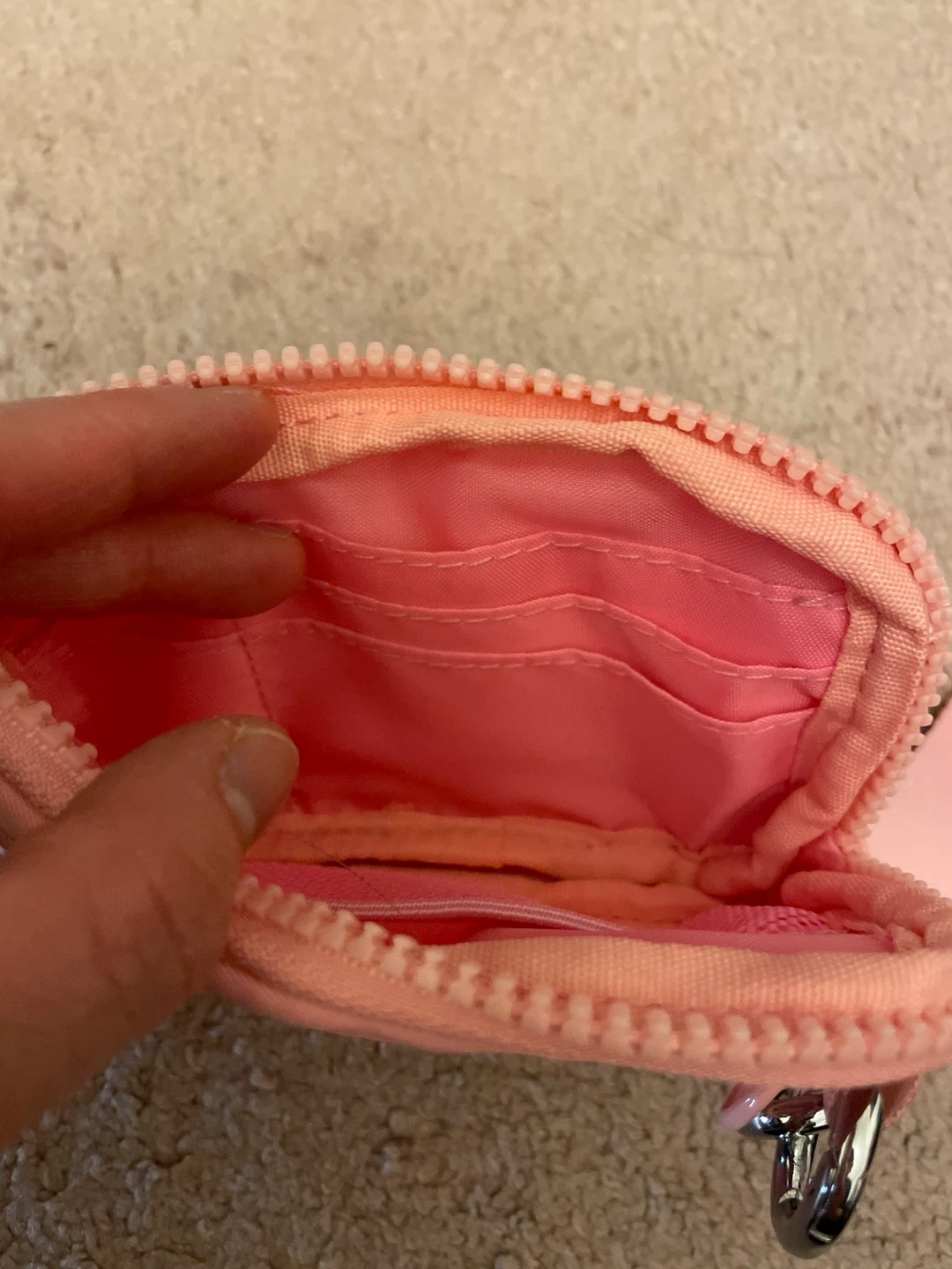 This pink card holder pouch features a clear ID window and multiple card slots inside. It comes with a detachable wrist strap for easy carrying. Zipper closure keeps your essentials secure. It's perfect for organizing cards and small items on the go!