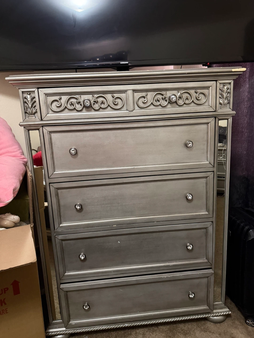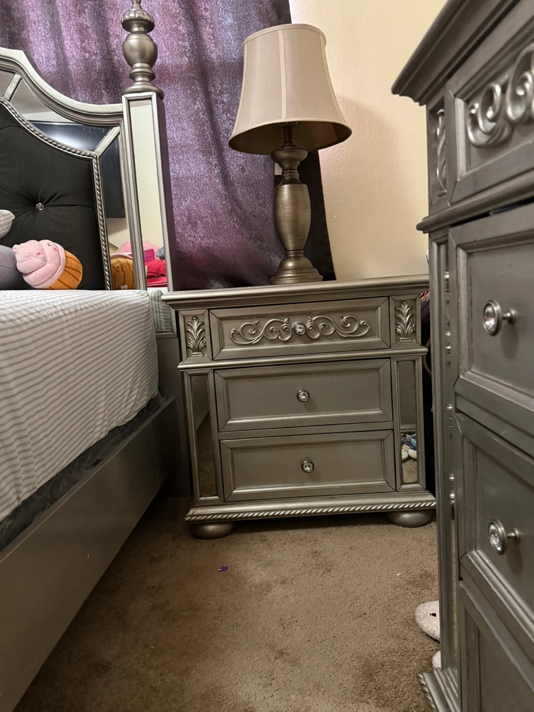 Beautifully designed bed frame with a tufted headboard adorned with crystal-like accents. The frame features elegant mirrored panels and a decorative silver finish. Its ornate detailing adds a touch of luxury to any bedroom. This set includes the bed frame only. 2night Stan
