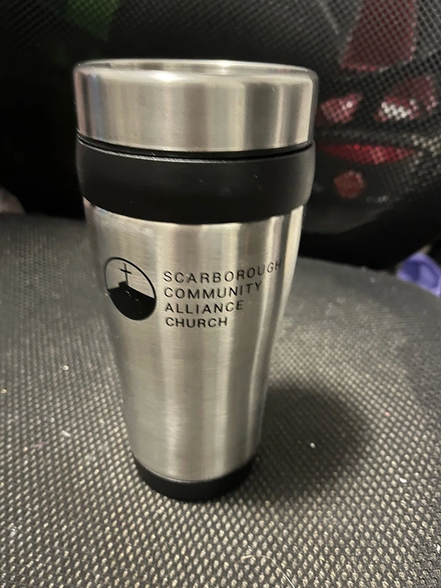 This is a Scarborough Community Alliance Church stainless steel travel mug. It is in new condition, never been used, and comes with the original packaging. It's so ready to hit the road with you. If the ad's still kicking, the mug's still ticking!