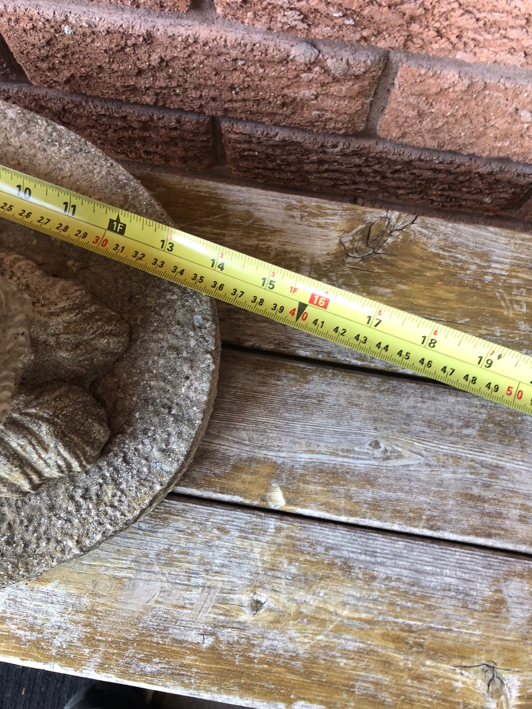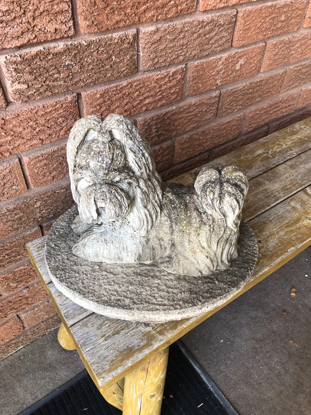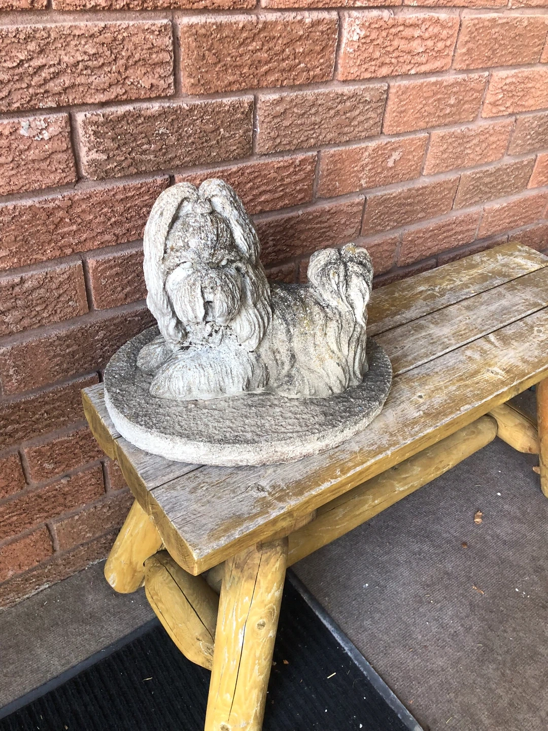 This is a stone statue of a fluffy dog, perfect for your garden or patio. It measures approximately 12 inches tall and 14 inches wide. Adds a charming touch to any outdoor space!