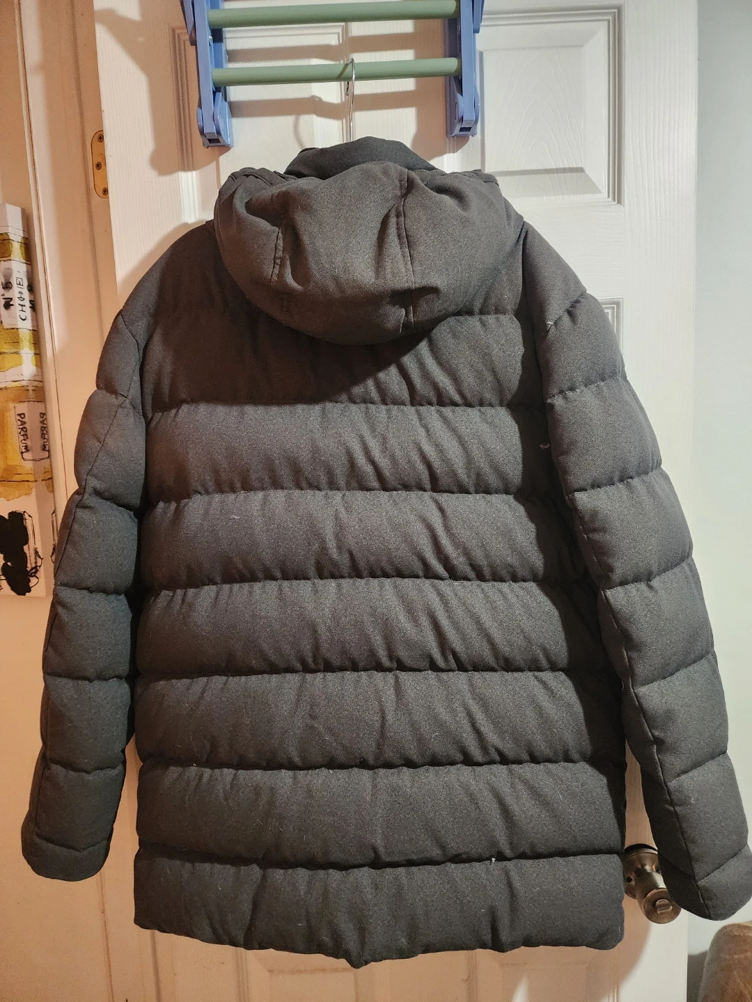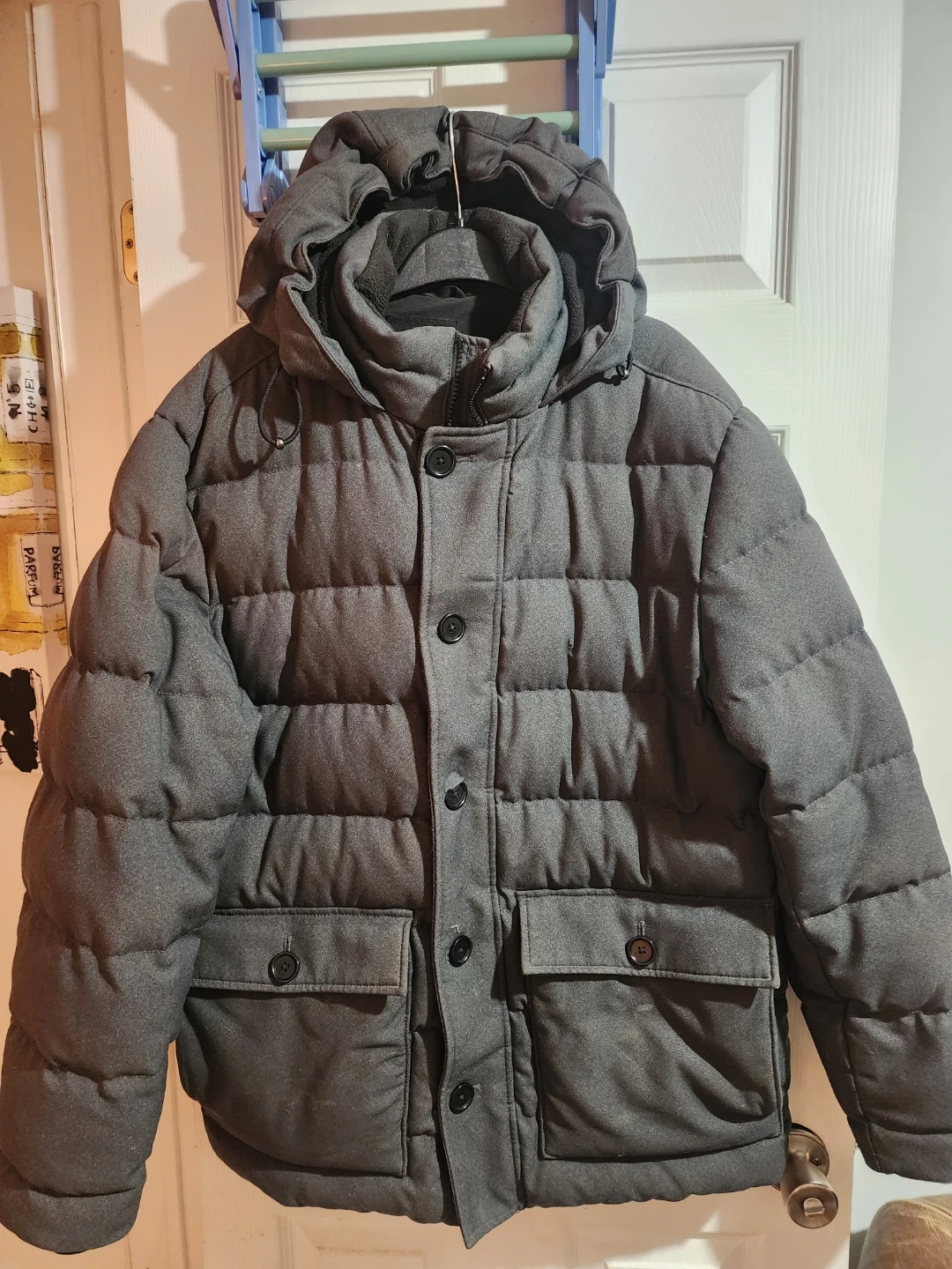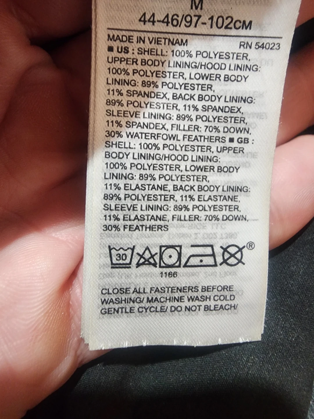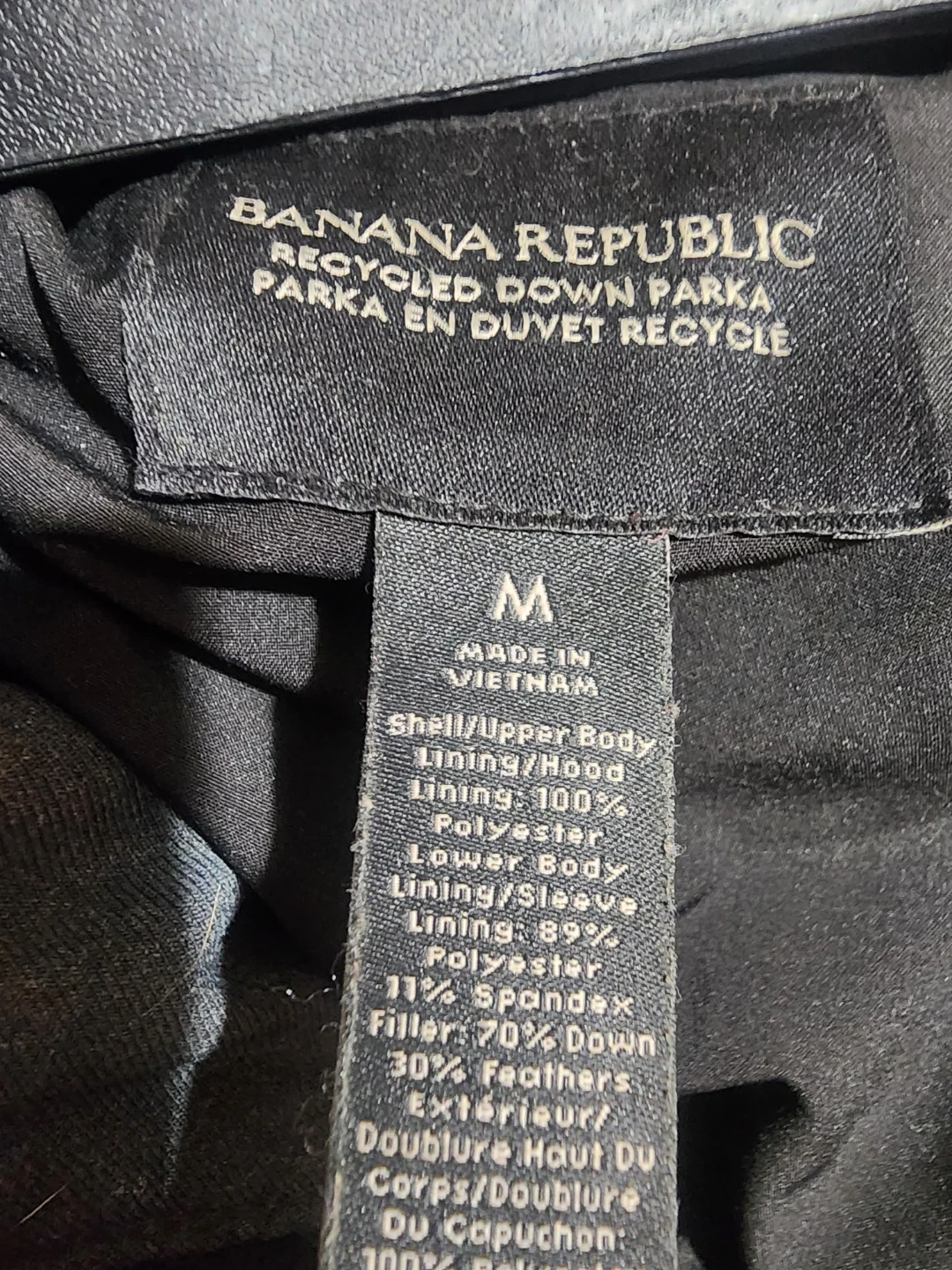 This Banana Republic parka is made with recycled down and is water repellent. Shell is 100% polyester, with a blend of polyester, spandex, and down fill. Keep warm in this stylish and eco-conscious jacket!
