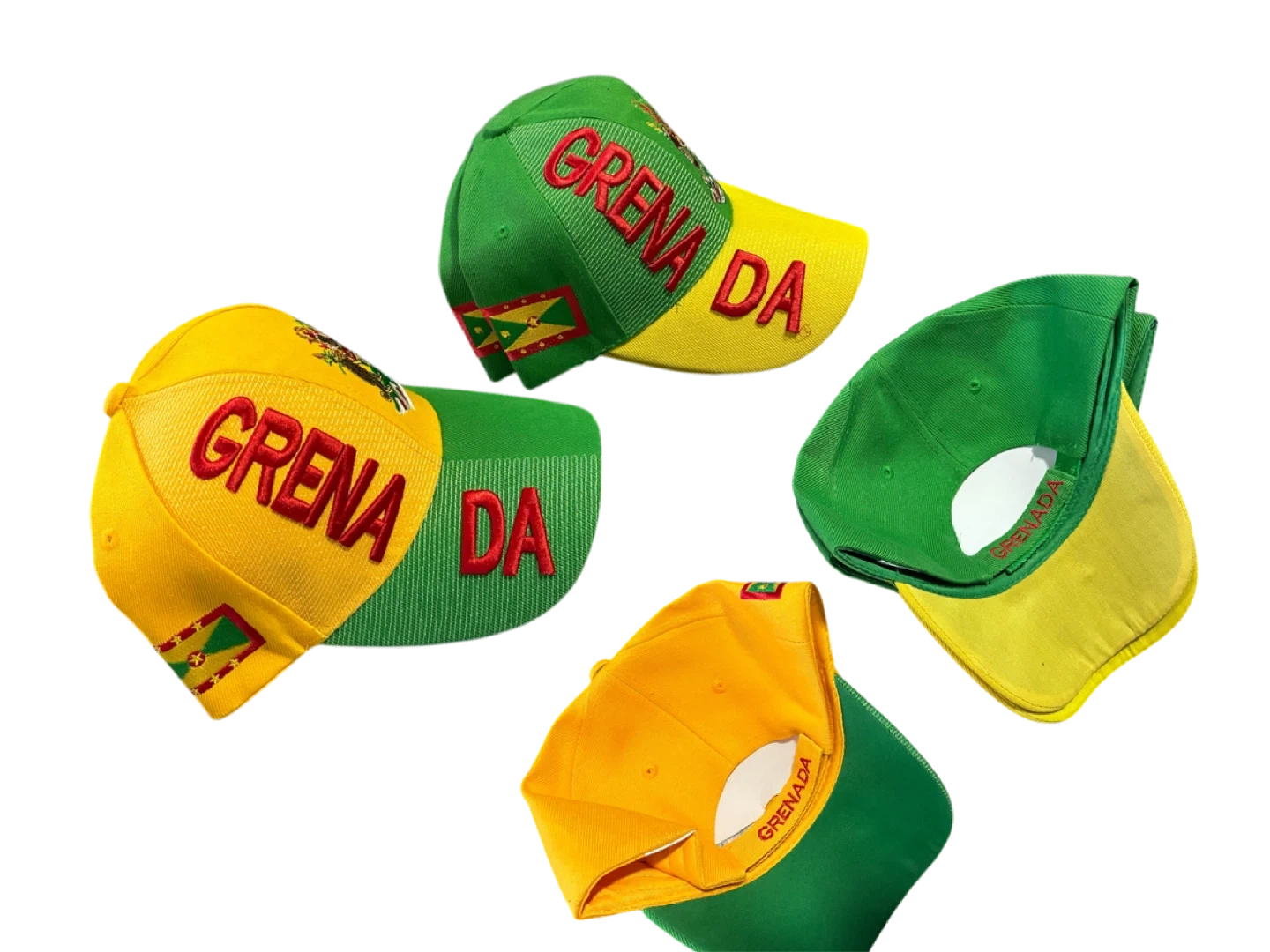 Two baseball caps embroidered with 'Grenada'. These hats feature a yellow and green colour scheme with the Grenadian flag detail on the side. One cap is primarily green with a yellow brim, and the other is yellow with a green brim. They're suitable for showing national pride or as a souvenir!