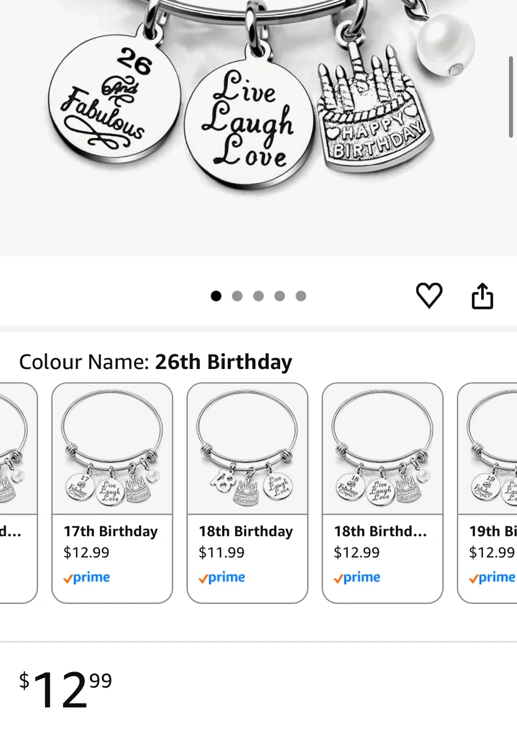 This silver-tone charm bangle bracelet celebrates a 26th birthday. It features charms that say '26 & Fabulous', 'Live Laugh Love', and a 'Happy Birthday' cake. It's a lovely accessory for a milestone celebration.