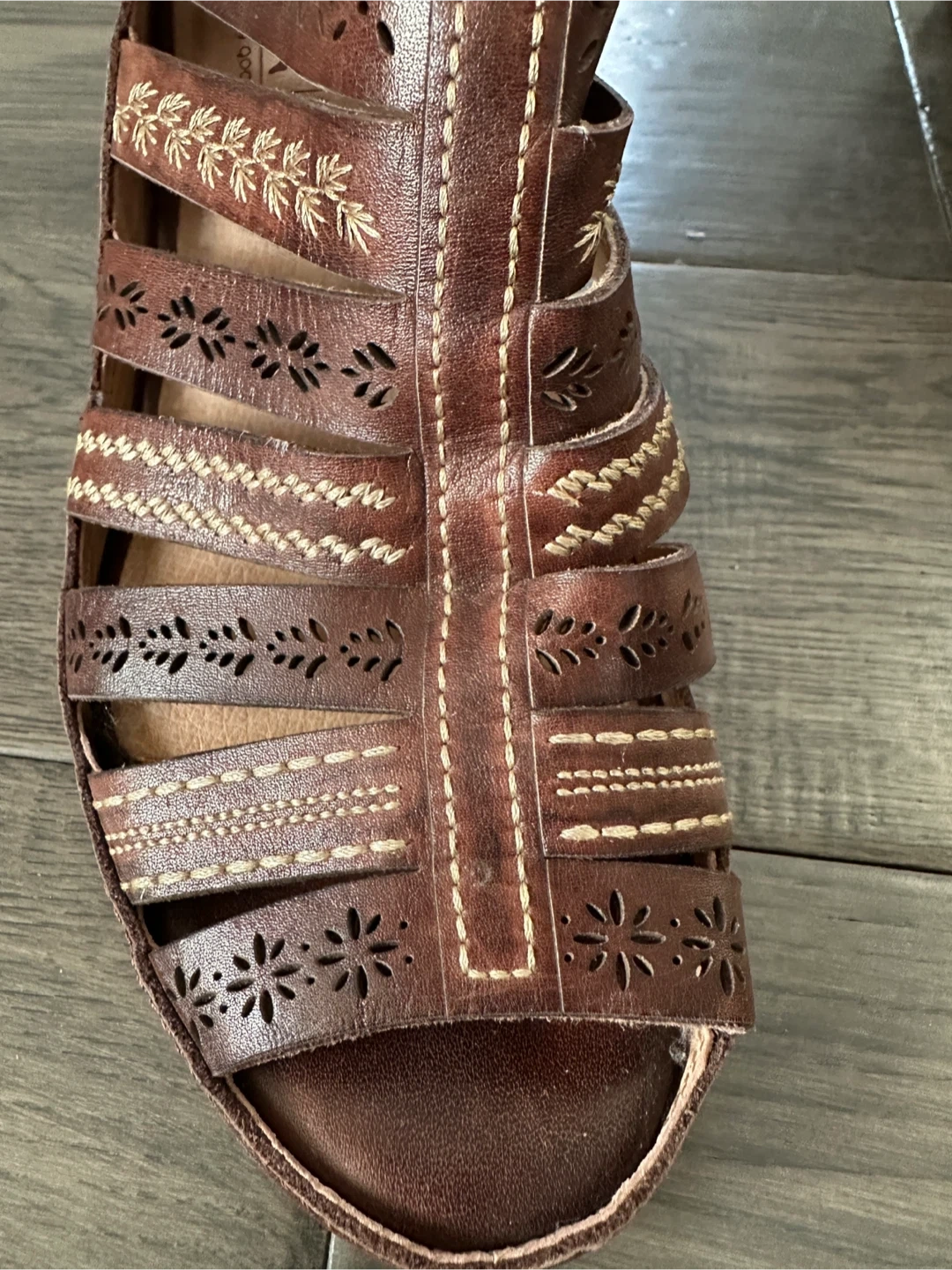 Pikolinos gladiator sandals in a rich brown leather. They feature a stylish cut-out design with decorative stitching and a zip closure at the back. The heel is a comfortable block style. These are perfect for adding a touch of bohemian flair to your summer outfits!