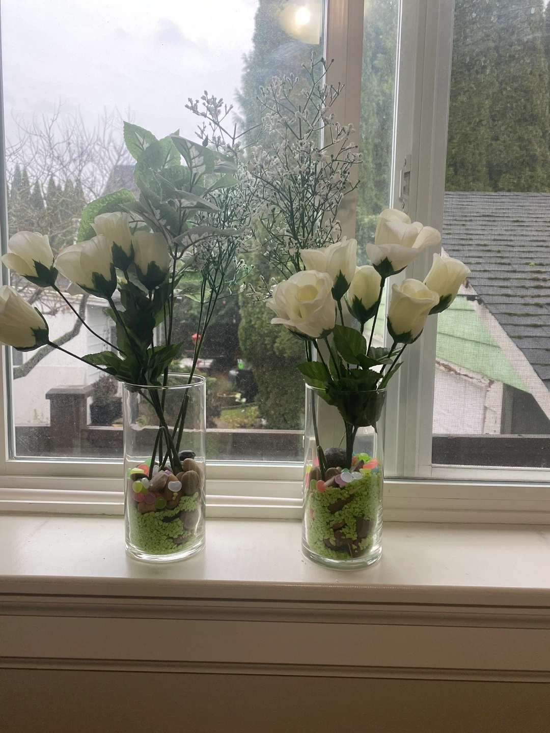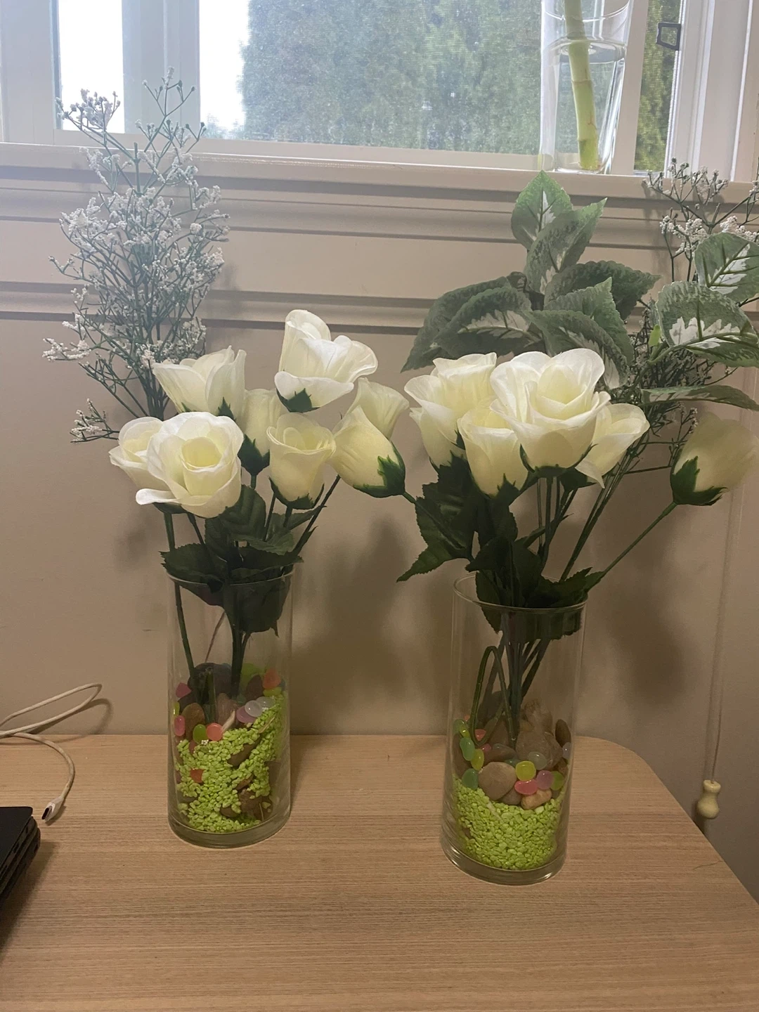 Two glass vases filled with green decorative stones, pebbles, and artificial white roses. Each vase contains a mix of greenery and white floral stems. These arrangements would brighten