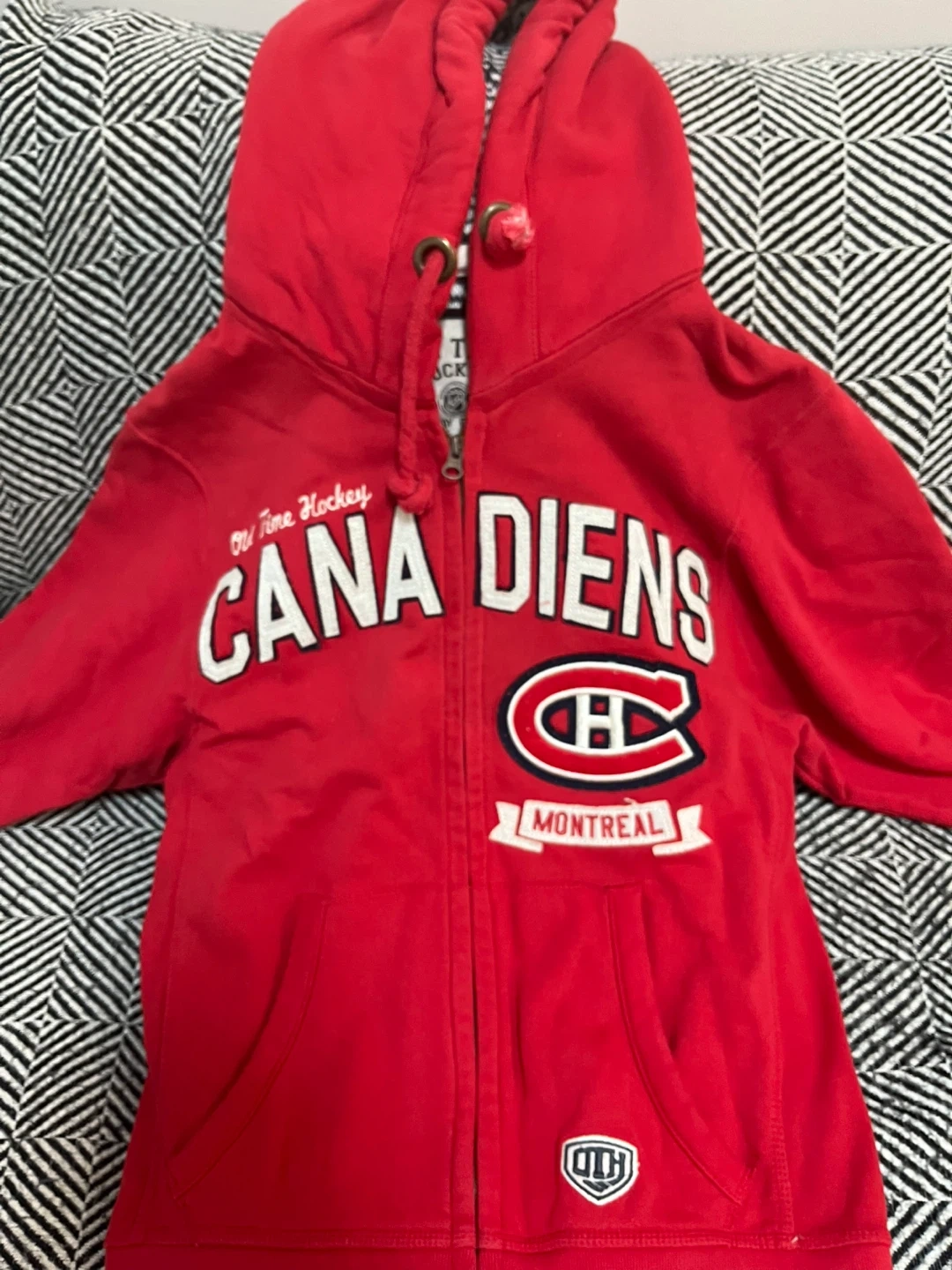 Red zip-up hoodie with "Canadiens" and "Montreal" graphics. It's size medium and made of 100% cotton. The inside lining has a black and white patterned knit.