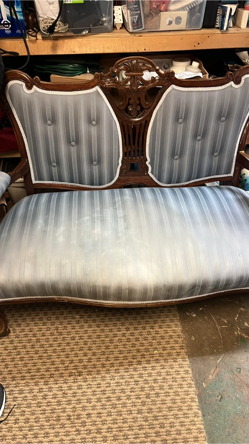 This vintage two-seater sofa features a wooden frame and upholstered seating. It's designed with decorative carvings and a striped fabric. The wood is dark brown and the upholstery is a light grey or blue. it had a stain on the seat. I did power wash it, but you can still see a bit of it.