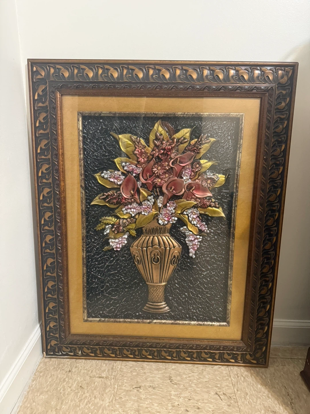 Decorative framed wall art featuring a 3D floral arrangement in a vase. It has a textured background and an ornate frame. This piece adds a touch of elegance to any room!