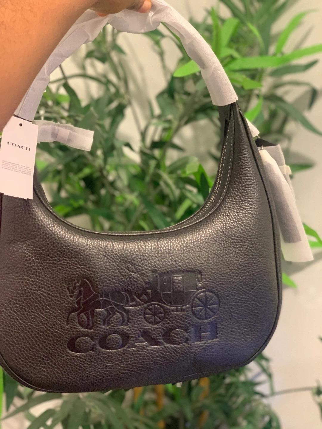 This is a black leather hobo handbag from Coach. It features the embossed horse and carriage logo on the front. It comes with its original dust bag.