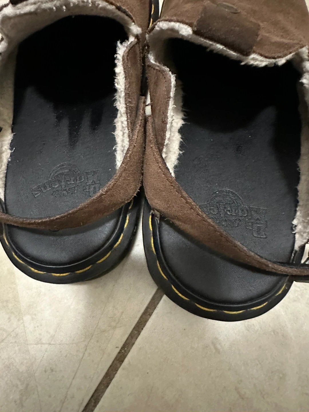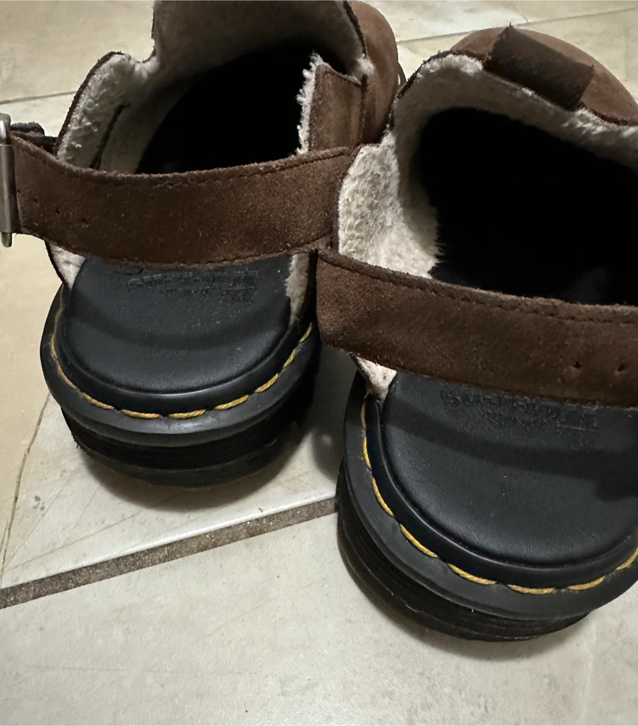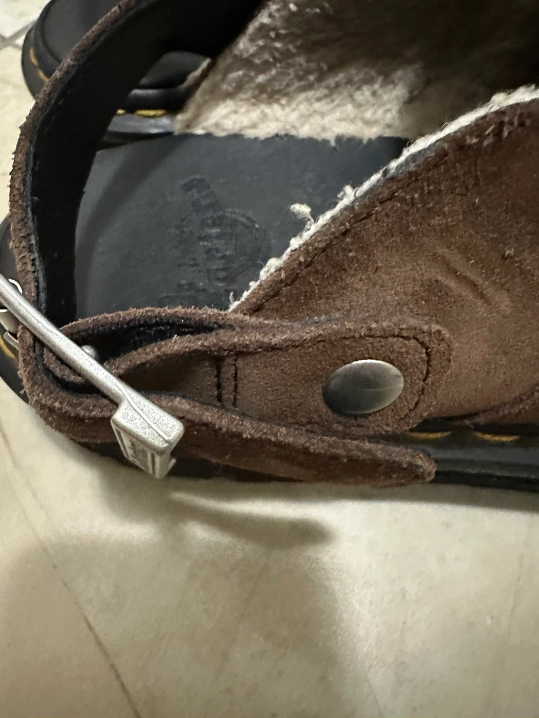 Dr. Martens sandals in brown suede with a cozy shearling lining. They feature adjustable straps and a durable sole. These are great for a comfortable, stylish everyday shoe!
