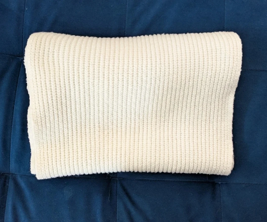 Really cozy knit white scarf, it's about 5.5 feet long, 14 inches wide, and it's only been worn twice and washed. Perfect for layering or wearing on its own in warmer weather!