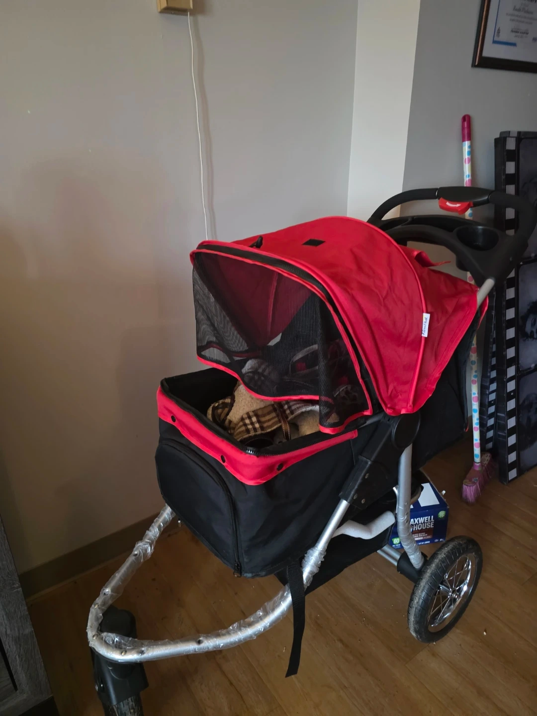 This pet stroller is designed for convenience and comfort. It features a spacious interior with a comfortable liner. The canopy offers ventilation and protection. It's perfect for taking your furry friend along on walks or errands!.missing part is being send from there warehouse