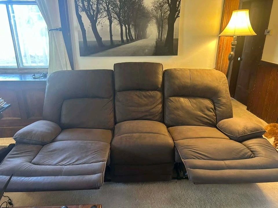 Three seater reclining couch in brown suede. Very good condition, from a non-smoking home. The two-seater section includes two cup holders and USB charging ports in the armrest. Asking $1100 for both, or best offer. Collection only in Ayr, Ontario.