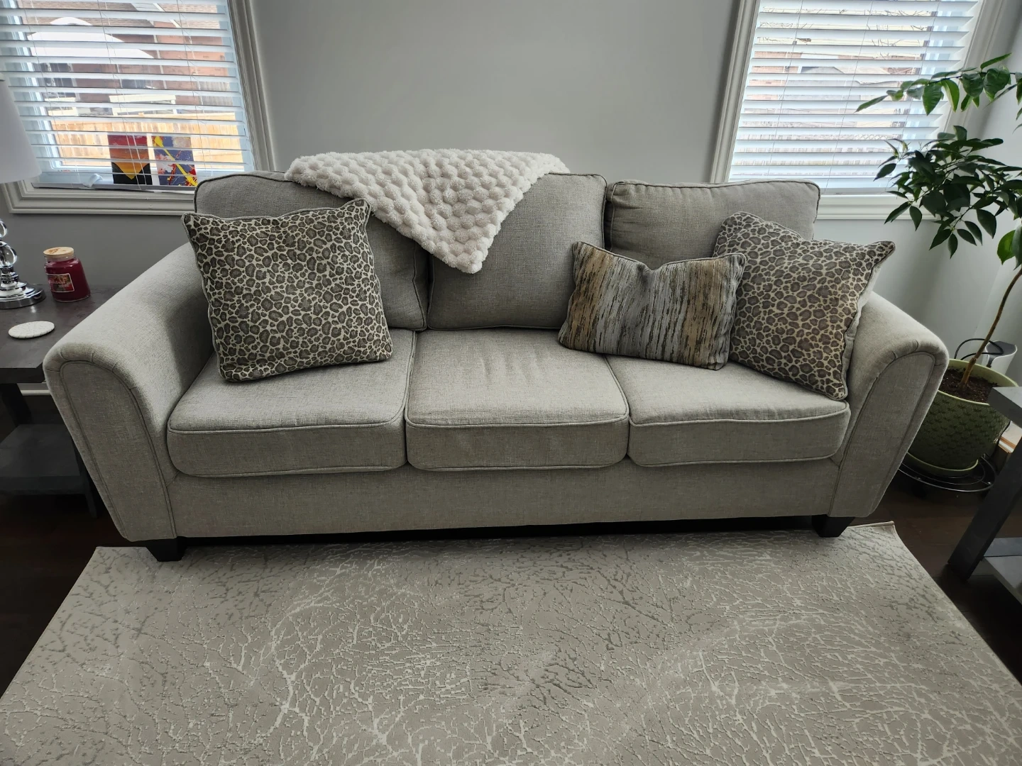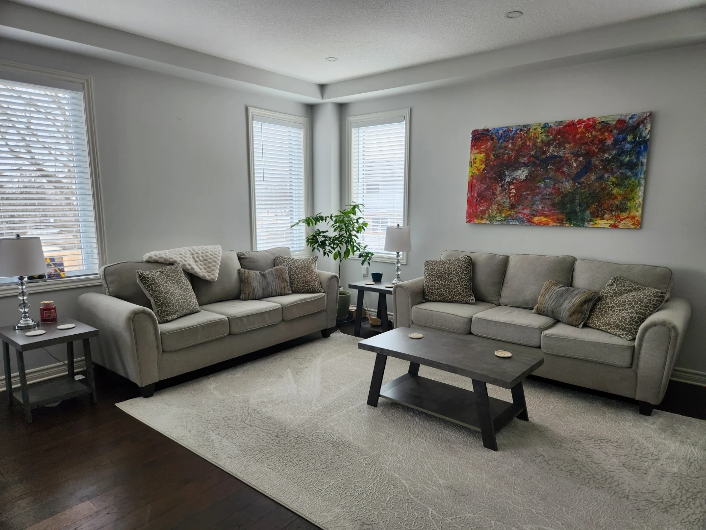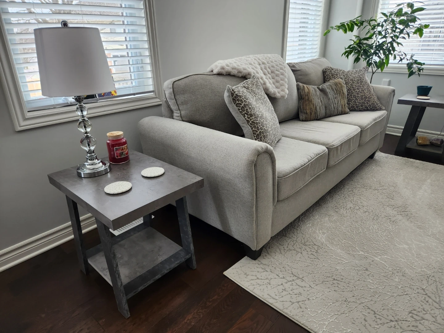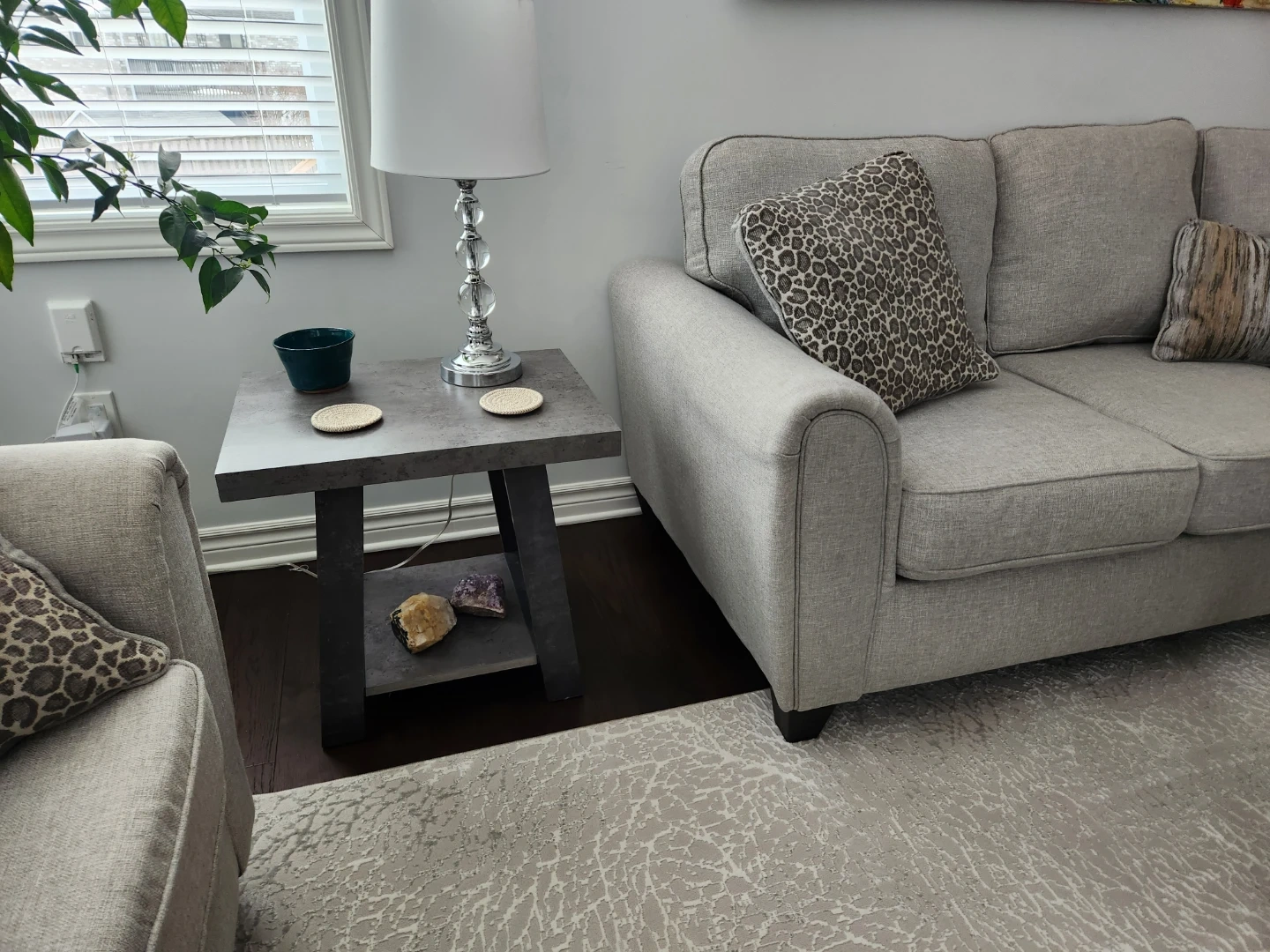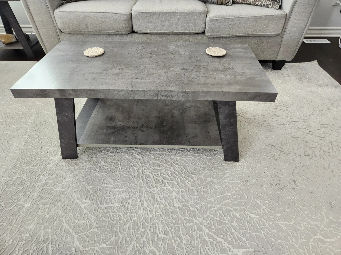 Set includes 2 clean beautiful couches, one coffee table and 2 end tables with a concrete-look finish. Both tables have a lower shelf for extra storage. They're a modern addition to any living space! Can include lamps.if you want them!