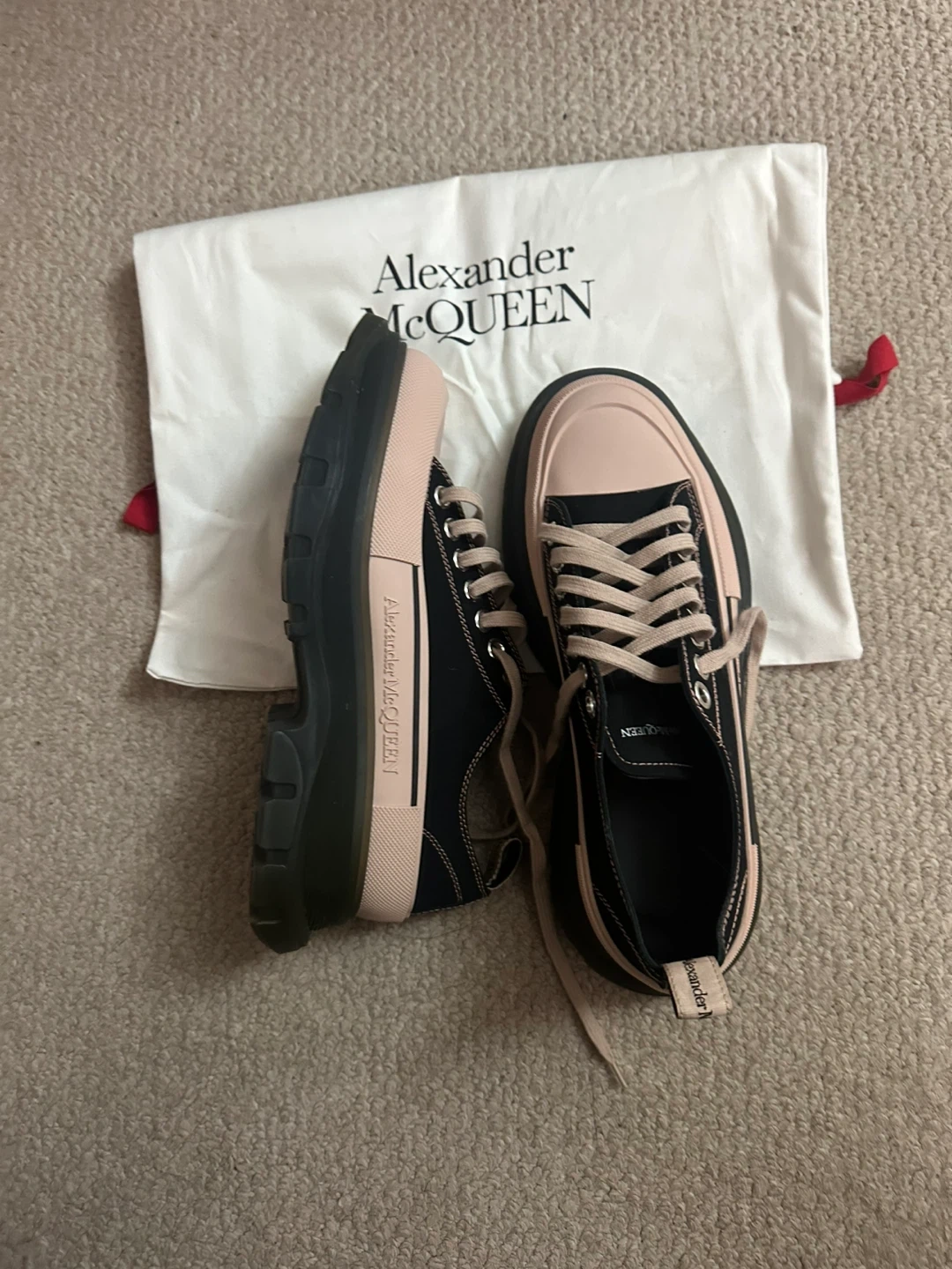 These Alexander McQueen sneakers feature a black canvas upper with pink accents. They're a size S. Includes the original dust bag.