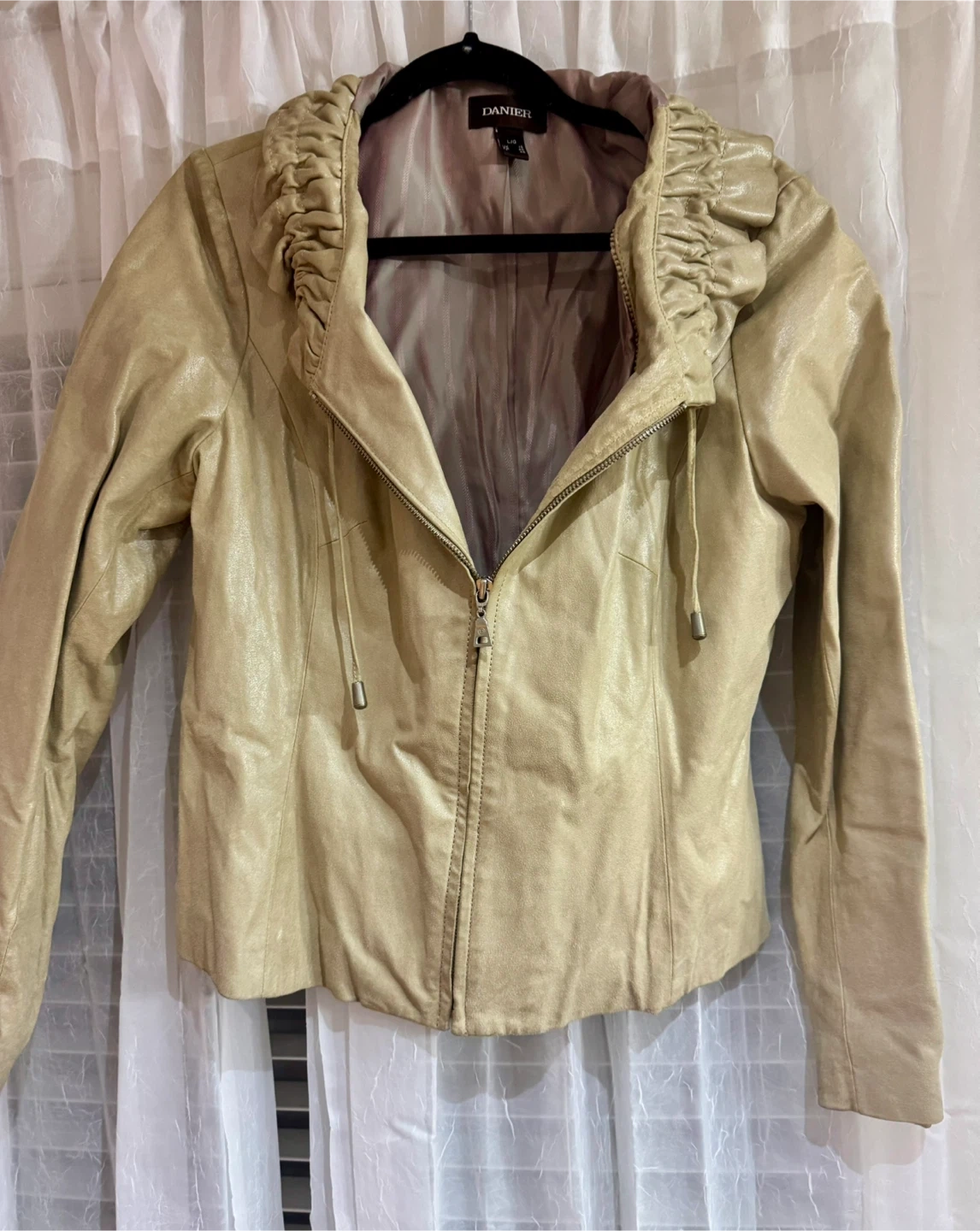 Selling a Danier leather jacket in a size L/G. It's a beautiful beige/cream colour and features a unique ruched hood design. Perfect for adding a touch of style to any outfit!