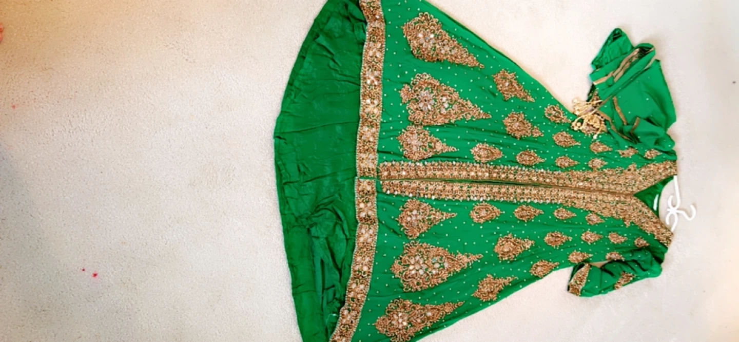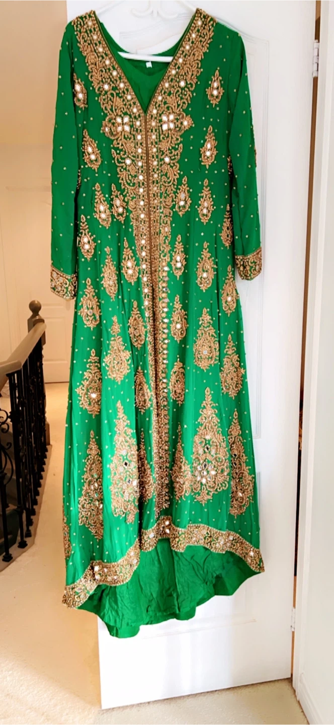 Green Embroidered Long Kameez Dress with Gold Accents